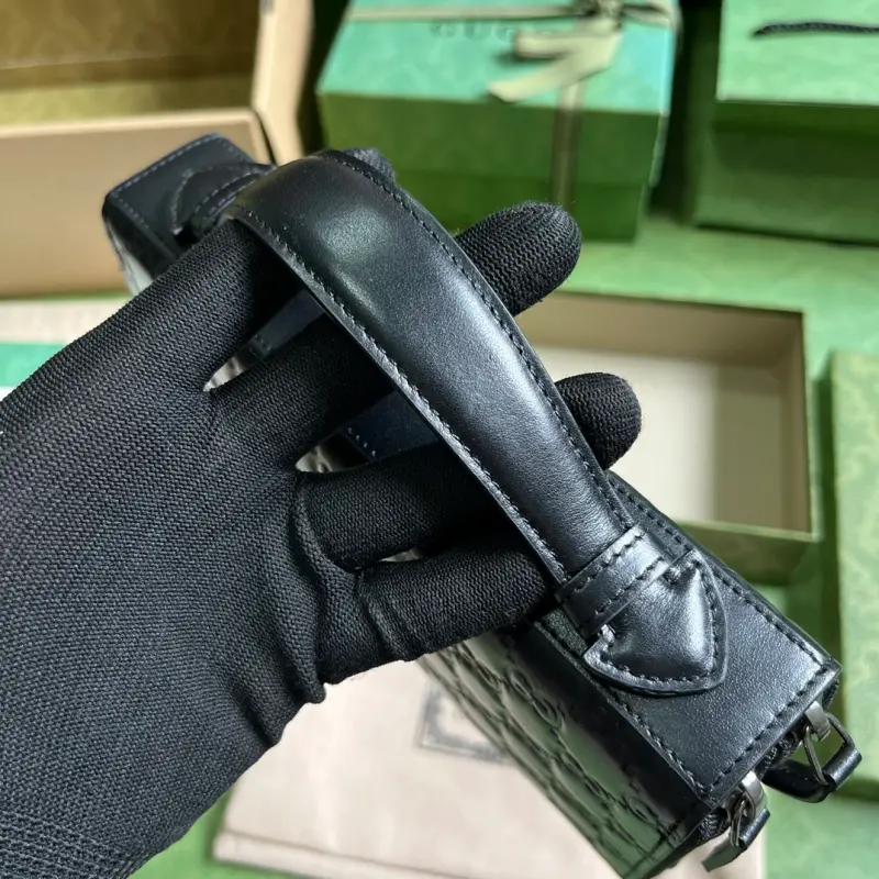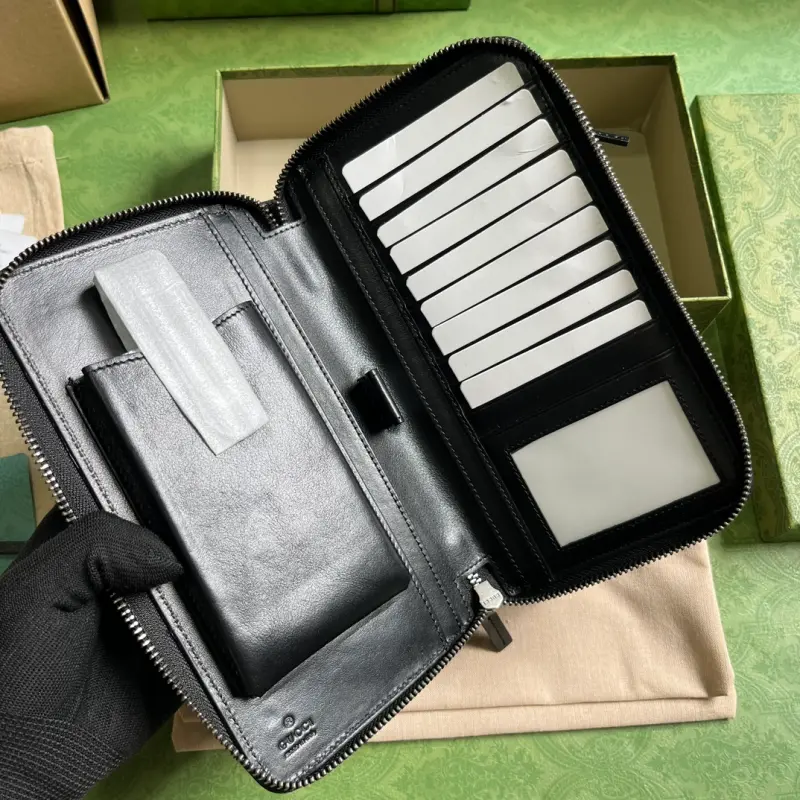 [Includes full original green box packaging] Super Double G travel document holder. The black Super Double G design makes a dazzling return in the Pre-Fall 2023 collection, appearing on a variety of small leather pieces. A reimagined interpretation of Gbago Gbag’s initials, the Super Double G motif is presented in an oversized, striking silhouette, evoking the timeless allure of the brand’s iconic logo. This travel document holder features a zipper closure, and the signature leather material imbues the design with its essence. Lined with moir?? fabric, it features a zipper closure. Model No. 395474. Dimensions: 21.5 cm (width) x 14 cm (height) x 4.5 cm (depth). Color: Black/embossed G leather.