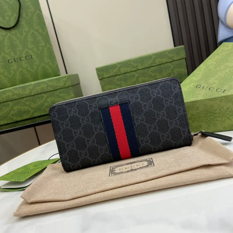 Zippered wallet with GG details (comes with the original green box). Gbag’s small leather accessories push the boundaries of design, constantly reinterpreting classic pieces in unique ways. This men’s wallet expertly combines classic GG Supreme canvas with black GG hardware, creating a sophisticated, modern accessory. Black leather trim, moir?? fabric lining, GG details, interior: 12 card slots, 3 bill compartments. Model No. 408831. Dimensions: 19 (width) x 10 (height) x 2.5 cm (depth). Color: Black/PVC.