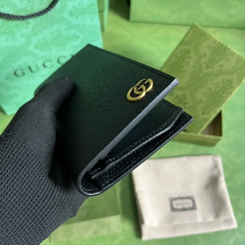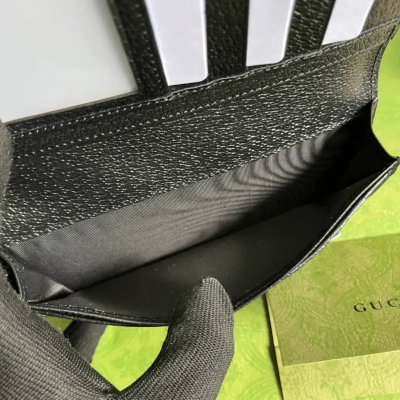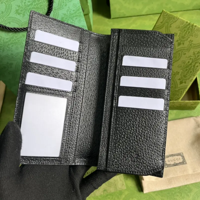 This GG Marmont long ID wallet, complete with original green box packaging, features the brand’s signature Double G hardware. Crafted from calfskin, this wallet features a heat-pressed, peccary-grain finish for a distinctive grainy feel. It features a black, metal-free leather Double G design, 12 card slots, 4 bill slots, and an ID window. Model No. 436023. Opened: 18.2 cm (width) x 17.5 cm (height). Closed: 9 cm (width) x 17.5 cm (height) x 2 cm (depth). Color: Black/Full Leather.