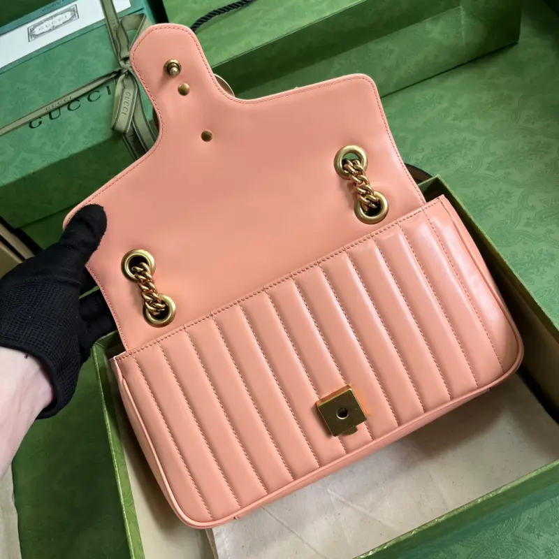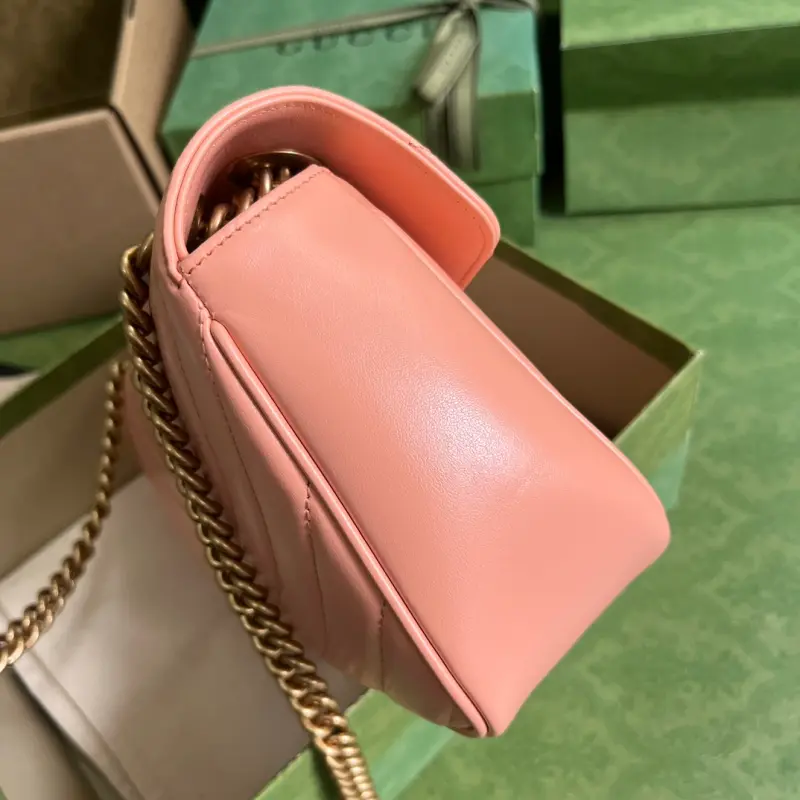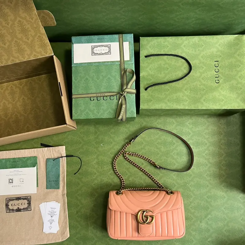 This small GG Marmont quilted shoulder bag, featuring a soft yet structured design, is cleverly integrated with antique gold-toned Double G hardware, adding a unique touch. The sliding chain shoulder strap is designed for versatile carry, allowing for easy transition between shoulder and hand carry. This shoulder bag is expertly crafted from quilted leather, incorporating a curved pattern created using innovative geometric patterns. It features sunset orange quilted V-shaped leather, antique gold-toned hardware, a suede microfiber lining with Double G detailing, an interior zippered pocket, and a sliding chain that adjusts to a shoulder strap with a 55cm drop or a top handle with a 30cm drop. It also features a spring-lock flap closure and can accommodate a maximum mobile phone size of 158mm (length) x 78mm (width) x 8mm (depth). This item can accommodate a Gbag card holder. Weight: Approximately 0.648 kg. Model No. 443497. Dimensions: 26(W) x 15(H) x 7cm(D) Color: Sunset Orange/Original Leather.