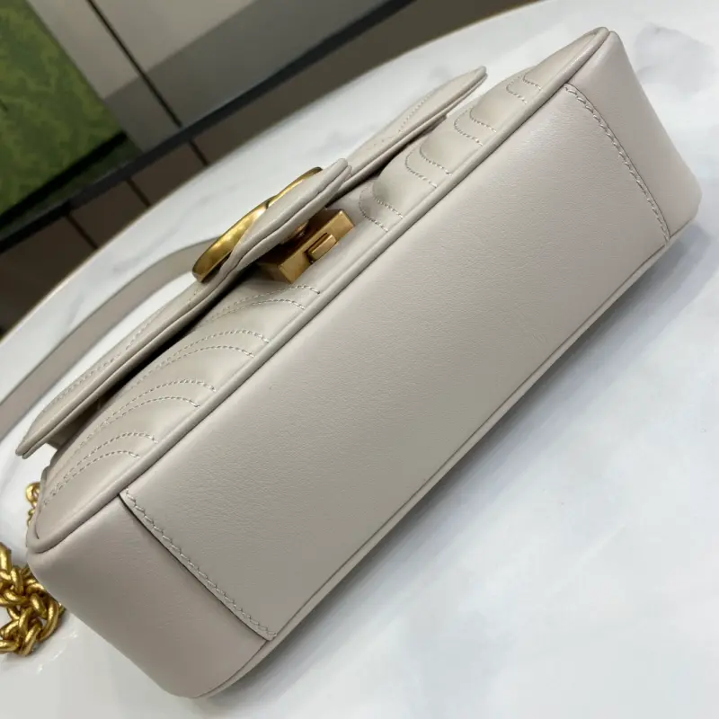 [Includes full original green box packaging] Original leather [New] GG Marmont Quilted Mini Handbag. This GG Marmont mini handbag features a highly recognizable shape in neutral light beige quilted V-shaped leather. It has a slightly structured body, a flap closure, and Double G hardware. This handbag offers versatile carry options, with a simple sliding metal chain for easy transition between shoulder and handbag. It features light beige quilted V-shaped leather, antique gold-tone hardware, and a suede microfiber lining with Double G. The sliding chain strap can be used as a shoulder strap (55 cm drop) or a top handle (30 cm drop). It can also be worn crossbody. It has a spring-lock flap. Weight: Approximately 0.6 kg. Model No. 446744. Dimensions: 22 cm (width) x 13 cm (height) x 6 cm (depth). Color: Light gray/original leather.