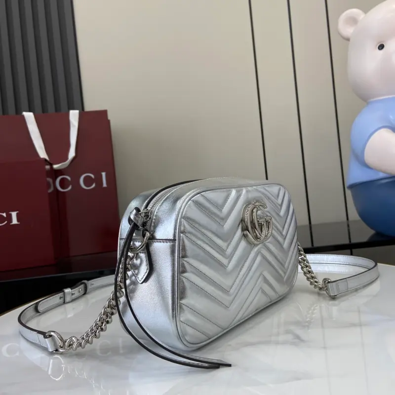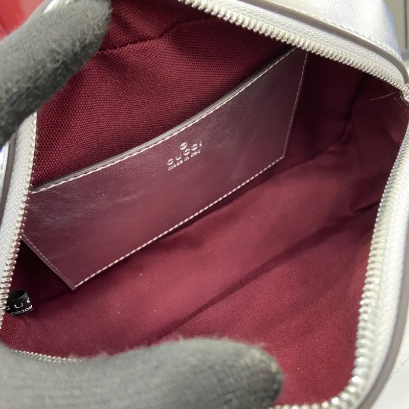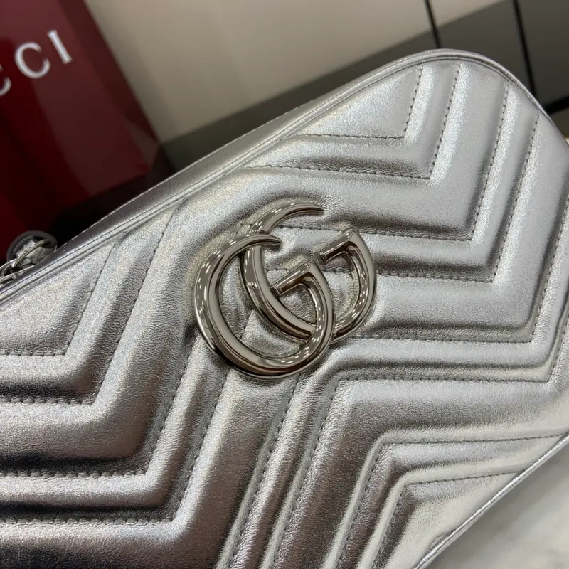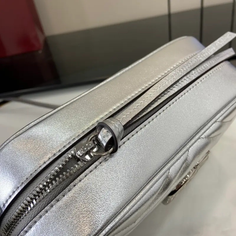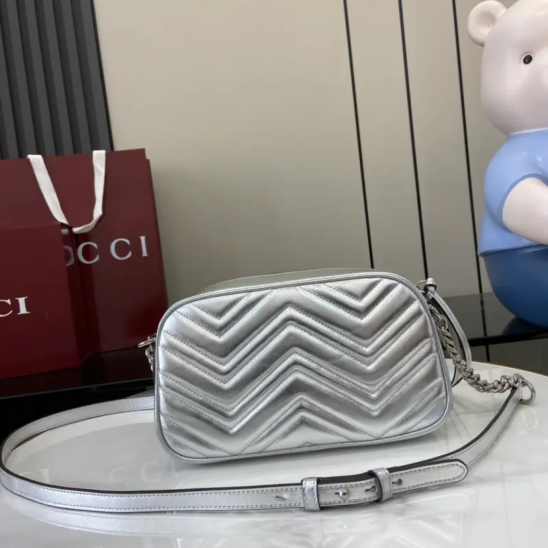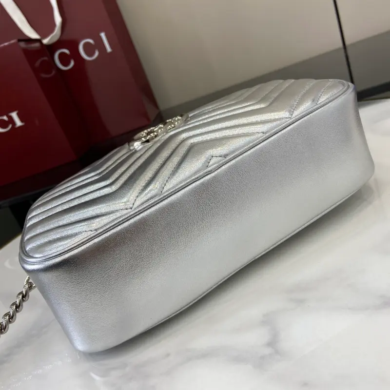 [Comes with a full set of original green box packaging] [New] GG Marmont series mini handbag From mirror leather to sparkling crystals, Gbag celebrates the gift-giving season with a variety of dazzling items. Choose printed accessories or shiny leather wallets to inject a touch of vitality into the whole look. This GG Marmont series super mini handbag is crafted with silver metallic leather. Silver metallic V-shaped leather, silver-toned accessories, cotton and linen blend lining, comes with a keychain that can be connected to the handbag separately, double G, chain shoulder strap (60 cm high), weight: approximately 0.394 kg. Maximum capacity: iPhone Pro Max/Plus, Airpods headphones, card holder and lipstick model: 447632. Dimensions: 24 (length) x 13 (height) x 7cm (thickness) Color: silver full leather/original leather. Made in Italy