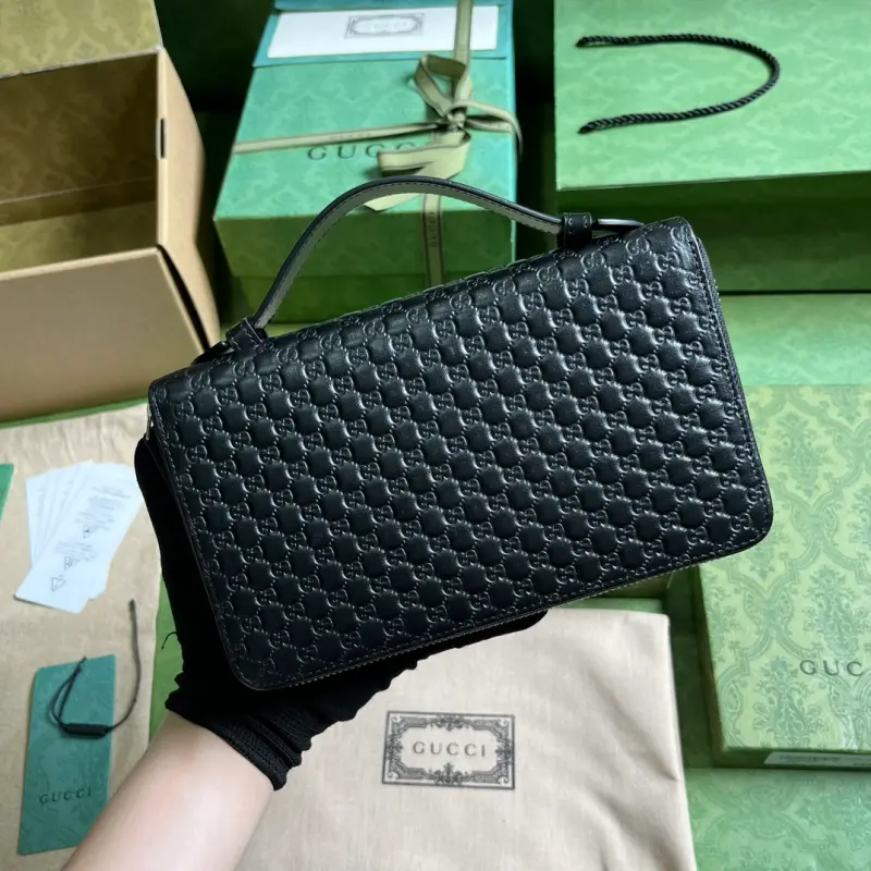 [Includes full original green box packaging] Super Double G travel document holder. The black Super Double G design makes a dazzling return in the Pre-Fall 2023 collection, appearing on a variety of small leather pieces. A reimagined interpretation of Gbago Gbag’s initials, the Super Double G motif is presented in an oversized, striking silhouette, evoking the timeless allure of the brand’s iconic logo. This travel document holder features a zipper closure, and the signature leather is a key element of the design. Lined with moir?? fabric, it features a zipper closure. Model No. 449246. Dimensions: 21.5 cm (width) x 14 cm (height) x 4.5 cm (depth). Color: Black/embossed leather.