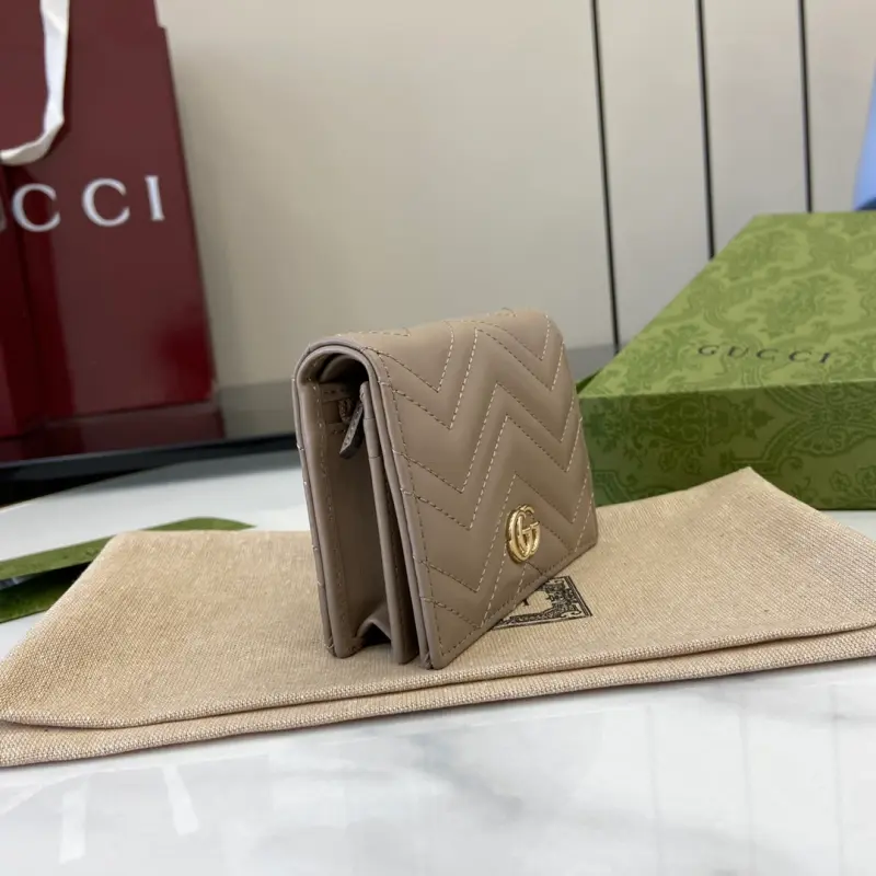 GG Marmont quilted card holder. Like the various shades of taupe, Gbag’s timeless designs are reimagined with each season. For the Spring/Summer 2025 collection, taupe graces the new leather goods collection with a timeless, vibrant touch. This classic GG Marmont card holder is meticulously presented in a vibrant, quilted taupe leather with gold-tone hardware and a moir?? fabric lining with a Double G. It features five card slots, two flat pockets, a zippered pocket, and a snap-fastening bill compartment. Model No. 466492. Dimensions closed: 11cm (width) x 8.5cm (height) x 3cm (depth). Dimensions open: 11cm (width) x 17.5cm (height). Color: Taupe/Original Leather.
