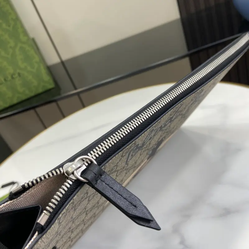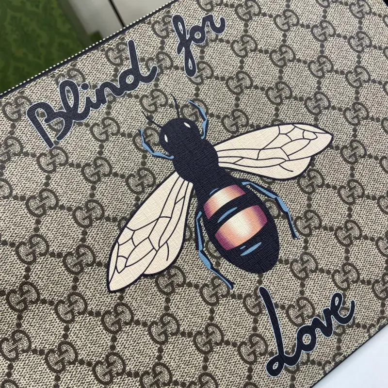 [Includes full original green box packaging] The Ophidia clutch features the GG logo, an evolution of the Gbag check that first appeared in the 1930s and has since become a Gbag staple. This new Ophidia clutch features this recognizable pattern in brown fabric. Double G hardware adds a touch of glamour to the look. Made of beige and black GG Supreme canvas, with black leather trim, palladium-tone hardware, and the Double G. Model No. 473904. Dimensions: 30.5 x 11.5 cm. Color: Brown/Bee PVC.