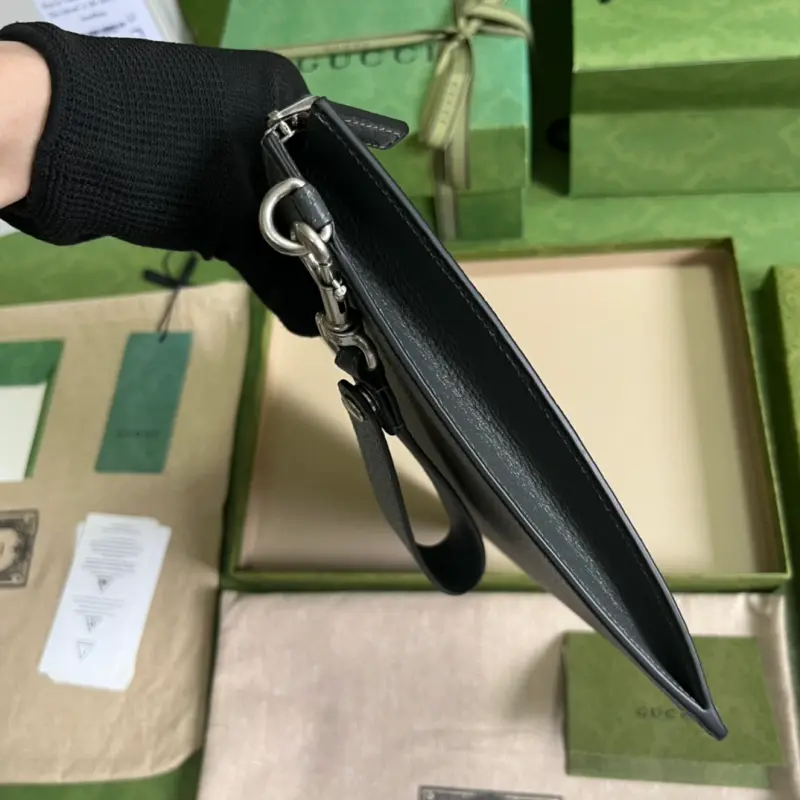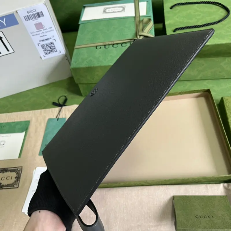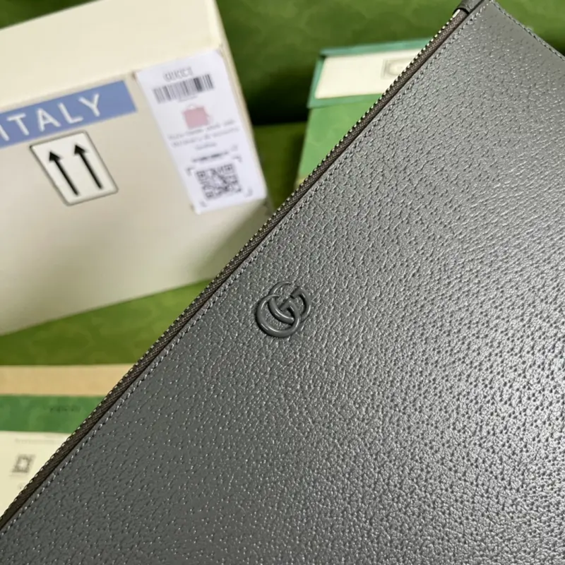 Gbag continues to update its GG Marmont clutch with more refined hues. With new color combinations and palettes, the brand reinterprets the classic GG Marmont collection with a modern perspective. This clutch is crafted from gray leather with palladium-toned hardware. It features gray leather, palladium-toned hardware, a detachable leather wristlet, six card slots, and an open pocket with zipper closure. Model No. 475317. Dimensions: 30.5cm (width) x 21cm (height) x 1.5cm (depth). Color: Gray/Full Leather.