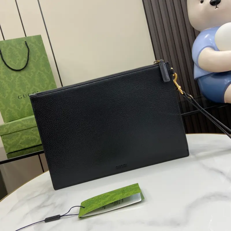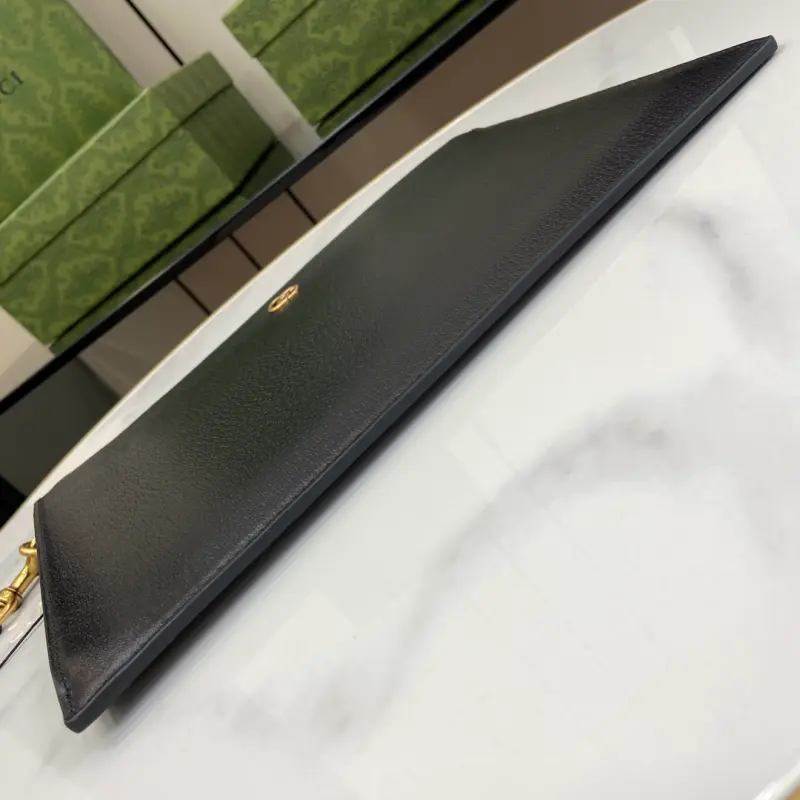 Gbag continues to update its GG Marmont clutch with more refined hues. With new color combinations and palettes, the brand reinterprets the classic GG Marmont collection with a modern perspective. This clutch is crafted from black leather with palladium-toned branding. It features black leather, palladium-toned hardware, a detachable leather wristlet, six card slots, an open pocket, and a zipper closure. Model No. 475317. Dimensions: 30.5cm (width) x 21cm (height) x 1.5cm (depth). Color: Black/Full Leather.