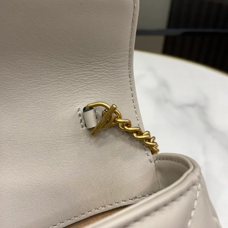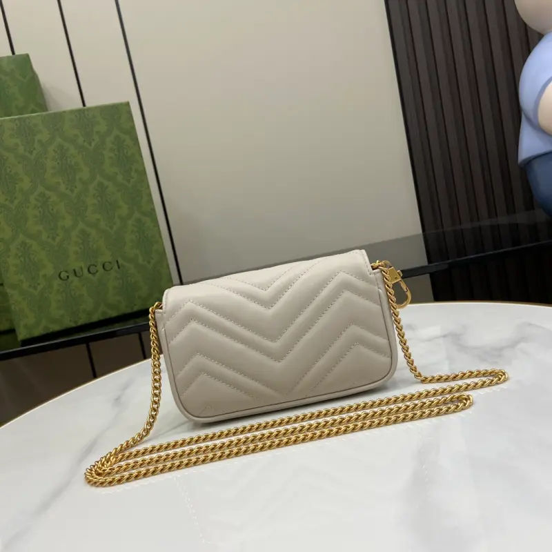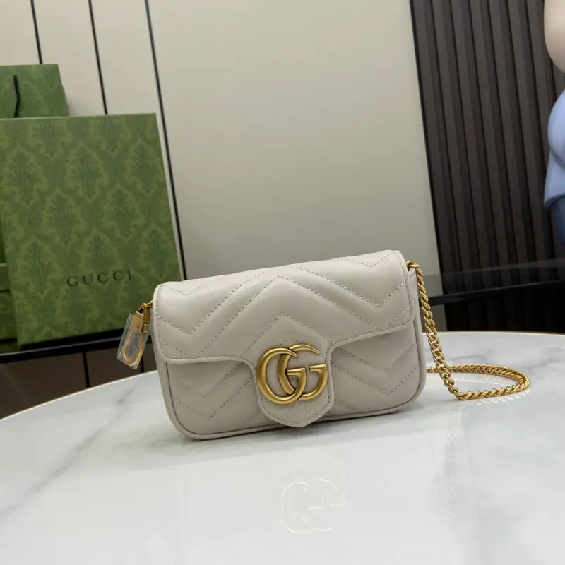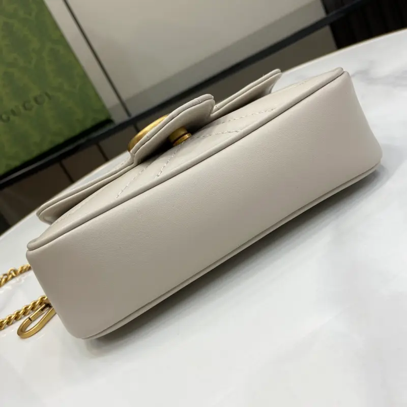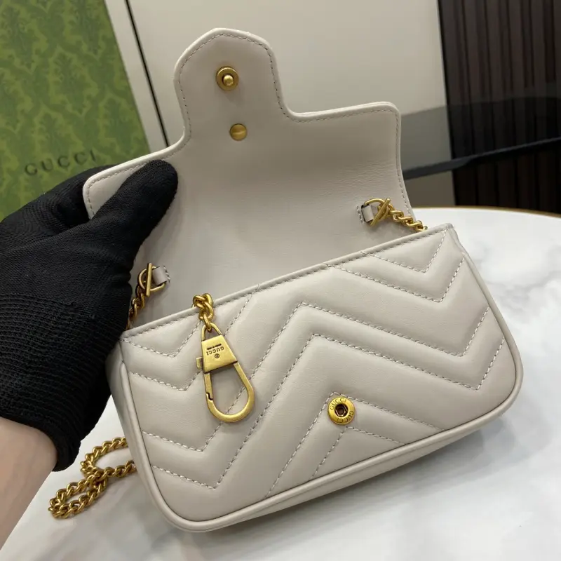 [Includes full original green box packaging] Original leather [New] GG Marmont ultra-mini handbag. Crafted from light gray quilted V-shaped leather, this ultra-mini handbag features antique gold-tone hardware embellished with the iconic Double G logo, adding a touch of color. A keychain can be used to attach this bag to other bags, further enhancing the design’s appeal. Features light gray quilted V-shaped leather, gold-tone hardware, a suede-like microfiber lining, and an included keychain that can be attached to the bag separately. It also features a Double G and chain shoulder strap (60 cm drop). Weight: approximately 0.35 kg. Model No. 476433. Dimensions: 10 cm (length) x 16.5 cm (width) x 4.5 cm (depth). Color: Light gray/original leather.