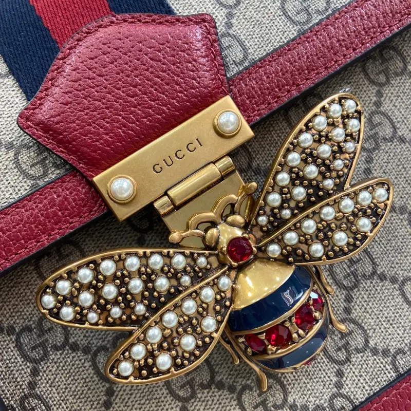 [Includes full original green box packaging] Classic Gbag Margaret details are paired with the brand’s emerging signature elements. The Queen Margaret series bag is crafted from GG fine canvas, a versatile material that continues to play a vital role in honoring the brand’s roots. The bee shape, a classic 1970s design, is inlaid with glass pearls and colored crystals. This small handbag features a clasp! Lined in a suede-textured microfiber. Model No. 476541. Dimensions: 25.5/17.5/13cm. Color: Red/original PVC leather.