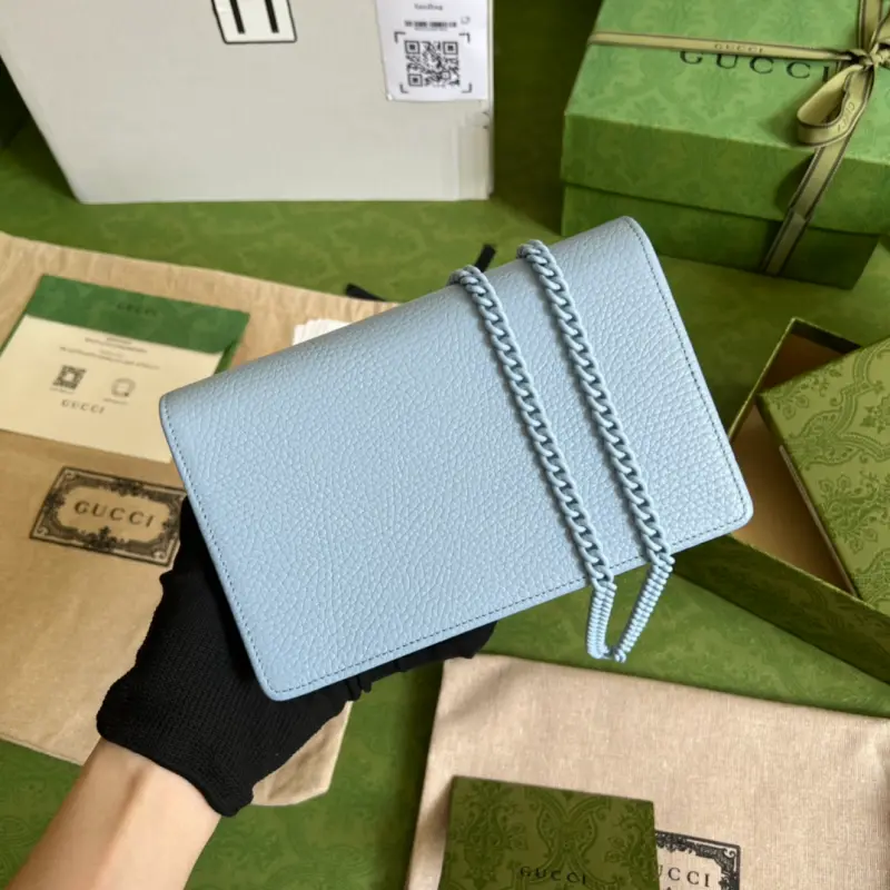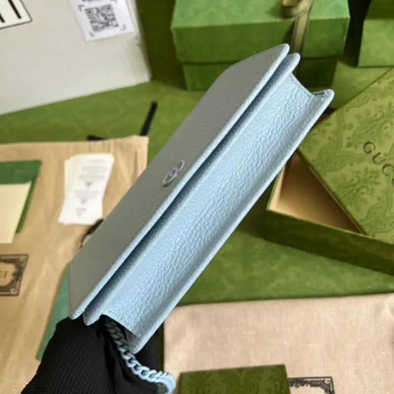 [Comes with a full set of original green box packaging] This GG Marmont series chain wallet reinterprets the designs of previous series and is made of refreshing light blue leather, bringing a stunning work to the “Gbag Love March” series. The double G accessories are derived from the belt buckle design of the 1970s and are reinterpreted in the same tone resin material on this wallet. The classic design is combined with the same tone color matching to highlight the modern fashion style. Light blue leather, light blue resin accessories, double G with cloud pattern fabric lining, zipper pocket and open pocket, six card compartment mirrors, detachable chain shoulder strap (60 cm high) snap button. Model: 497985. Dimensions: 20 (width) x 12.5 (height) x 4cm (depth) Color: light blue/two-tone full leather. Made in Italy
