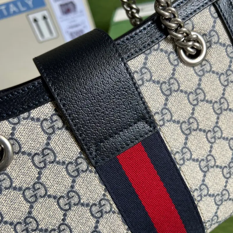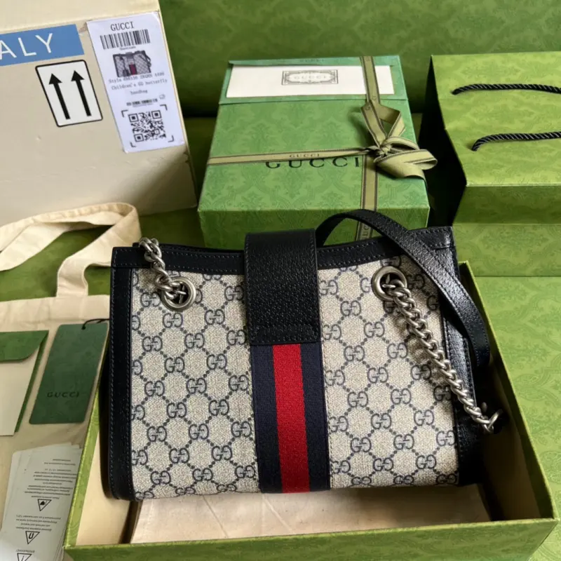 Comes with the original green box. This small Gbag Padlock chain bag features a sleek design inspired by the brand’s archive. Keys fit inside the removable leather key holder. This casual, retro bag is versatile and suitable for all ages. Model: 498156. Dimensions: 26*18*10cm. Color: Blue/PVC.