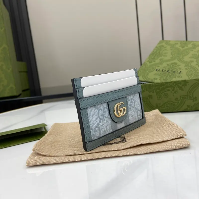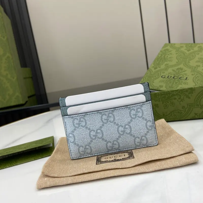 [Comes with a full set of original green box packaging] [New product] GG Ophidia series GG card holder. GG Supreme canvas interprets the Gbag small leather goods series, achieving a classic style. This Ophidia series card holder selects a fresh gray-blue to reinterpret the material, paired with a striped ribbon in the same tone, embellished with light gold-tone accessories, interpreting the new season fashion. Gray-blue GG Supreme canvas, gray-blue leather piping, light gold-tone accessories, gray-blue and light blue striped ribbon, cloud pattern fabric lining double G, four card compartments, 1 open pocket. Model: 523159. Dimensions: 10 cm (width) x 7.5 cm (height) Color: gray-blue/pvc. Made in Italy