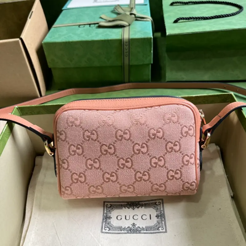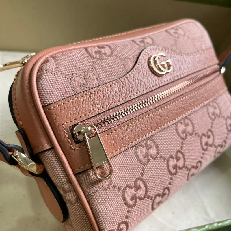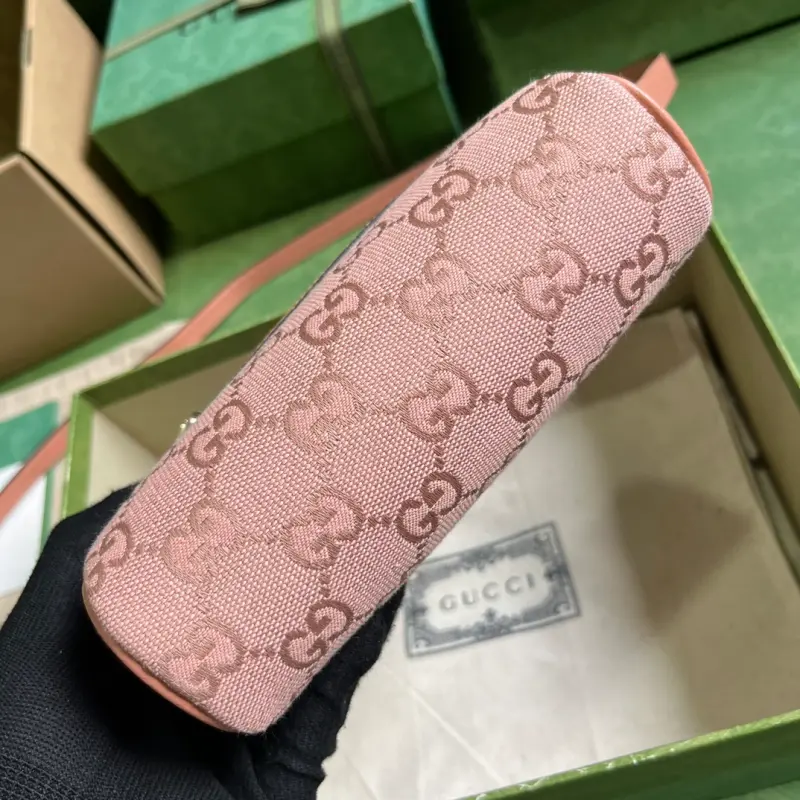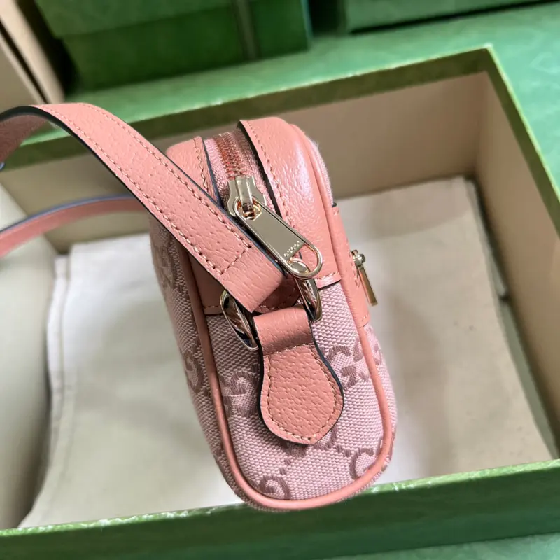 [Includes full original green box packaging] Ophidia GG mini handbag. As one of the most popular colorways, this distinctive pink color symbolizes luxury and joy. For the Pre-Fall 2023 collection, Gbag’s new pink GG canvas introduces a series of small leather pieces with a fresh twist; this Ophidia mini handbag, embellished with rose gold hardware, is one such masterpiece. It features pink GG canvas with pink leather trim, rose gold hardware, a cotton and linen lining with Double G, a front zippered pocket, an interior open pocket, an adjustable shoulder strap (60 cm drop), and a zippered closure. Model No. 574493. Dimensions: 17.5 cm (width) x 12 cm (height) x 5.5 cm (depth). Color: Pink Leather/Pink Canvas.