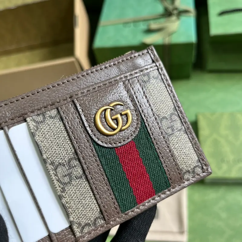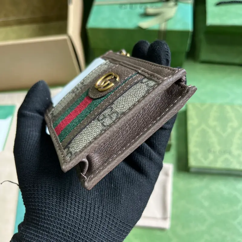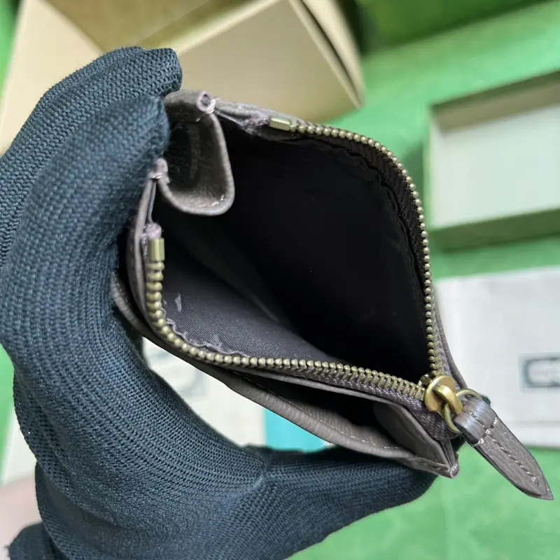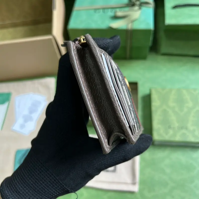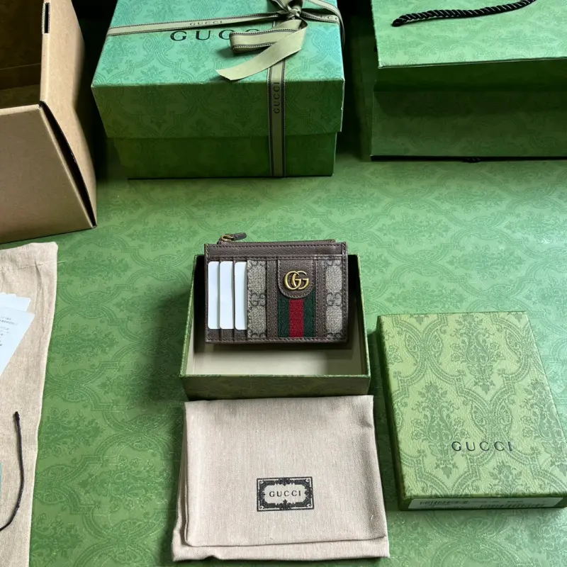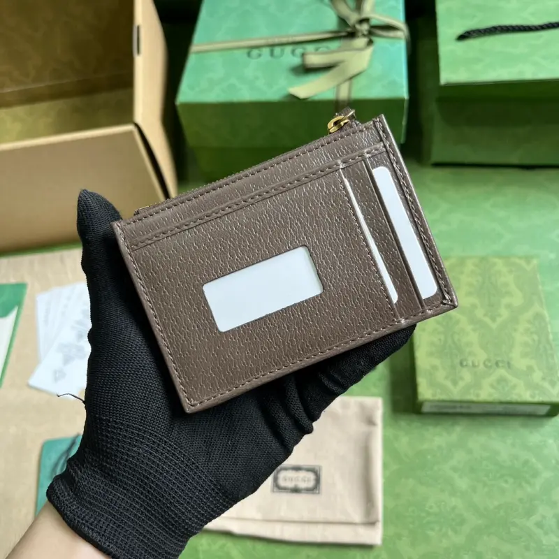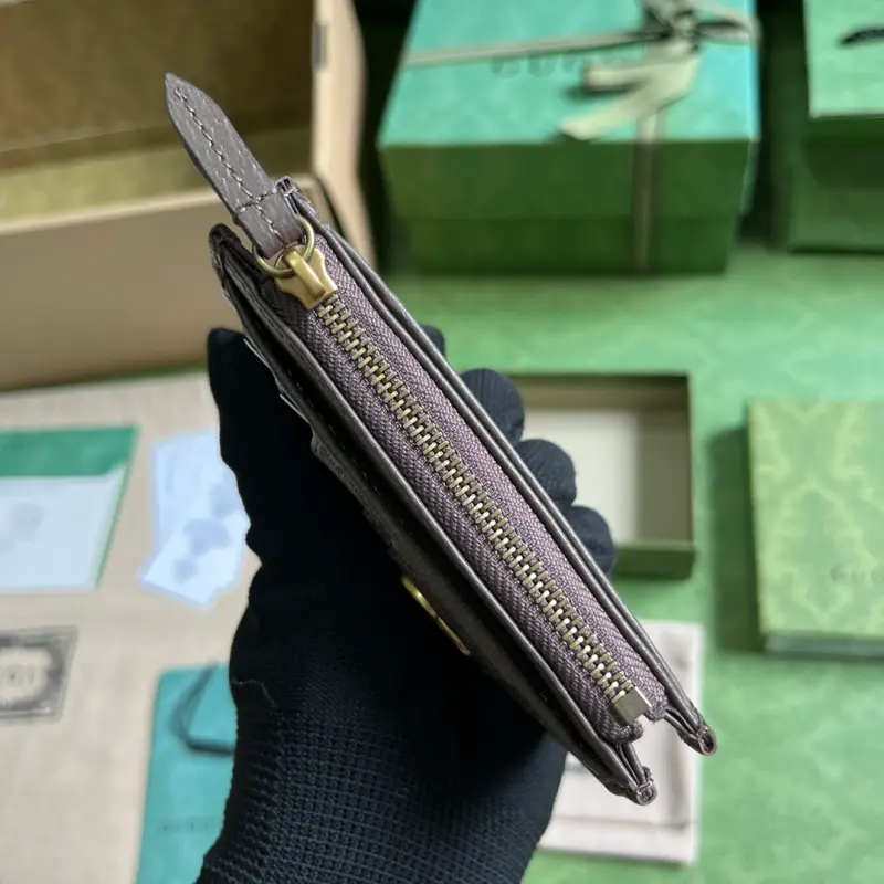 This GG Marmont card holder comes with a complete set of original green packaging. Each season, the brand’s iconic design details are reimagined, adding a new chapter to the brand’s rich design heritage. This card holder is crafted from black leather and embellished with the classic Double G symbol from the 1970s. It features brown leather, gold-tone hardware, a viscose lining with the Double G, six card slots, and a zippered pocket. Model No. 597608. Dimensions: 12 cm (width) x 8 cm (height). Color: Brown/PVC.