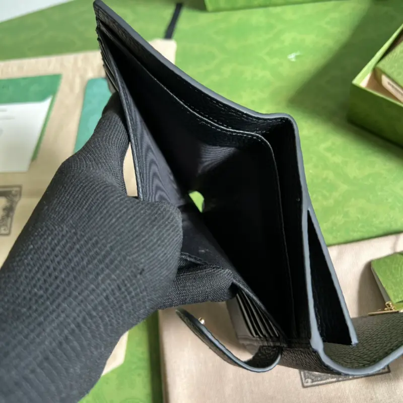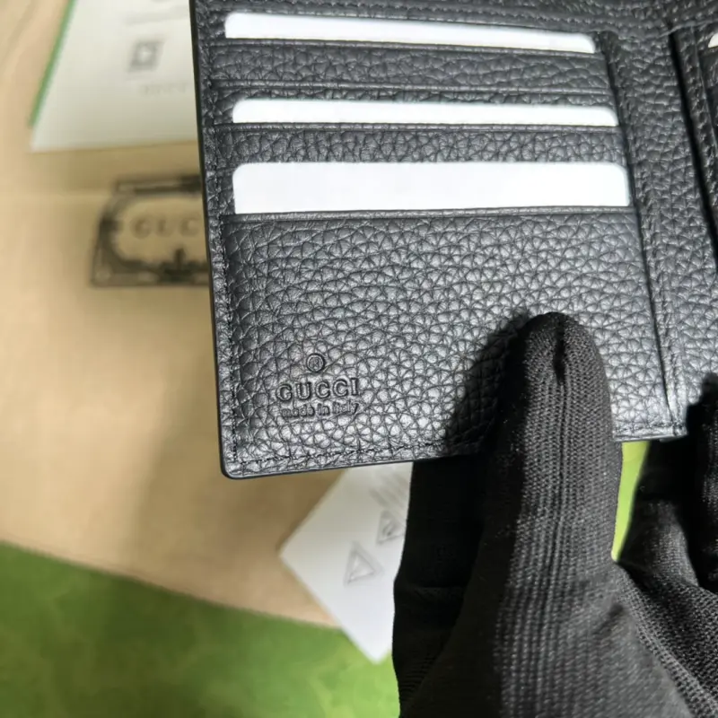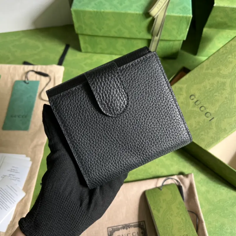 This GG tumbled cowhide wallet features a new interpretation of the GG pattern from the 2020 Early Fall collection. The soft, slightly lustrous GG leather is cleverly integrated with the weave and brand logo embossing on the black perforated leather, highlighting the exceptional design quality. The slender zipper design complements the detachable wrist strap. This black GG printed embossed leather is crafted from metal-free and chrome-free tanned leather. The leather used in this product is made using an alternative metal-free or chrome-free tanning process, which reduces the environmental footprint compared to traditional methods. Model: 615525. Dimensions: 12.5*11*3. Color: Black/tumbled leather.