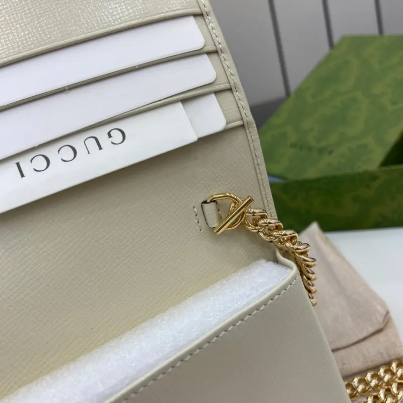 Gbag Horsebit 1955 wallet on chain. This wallet on chain is a new addition to the Gbag Horsebit 1955 accessories collection. Crafted from canvas featuring the brand’s signature Double G monogram, it features the double loop and long, rectangular design common to the collection’s bags. Its classic flap closure with snap closures houses several card slots and pockets, while the detachable chain strap allows for versatile styling. White leather details create a chic and stylish look. Made of beige/ebony GG Supreme canvas with white leather details, gold-tone hardware, a moir?? and suede lining, and a horsebit detail, it has six card slots, one zippered pocket, and one open pocket. The detachable chain strap has a 58cm drop and snap closure. Weight: approximately 0.3kg. Model No. 621892. Dimensions when open: 19(W) x 21(H) x 2.5cm(D) Dimensions when closed: 19(W) x 10(H) x 4cm(D) Colour: White/pvc.