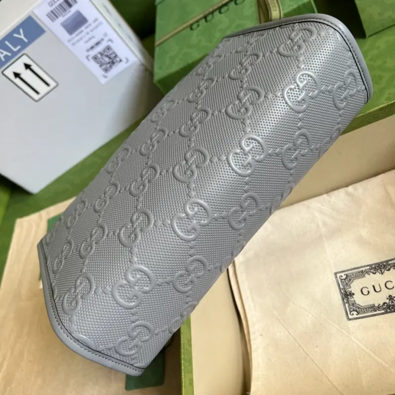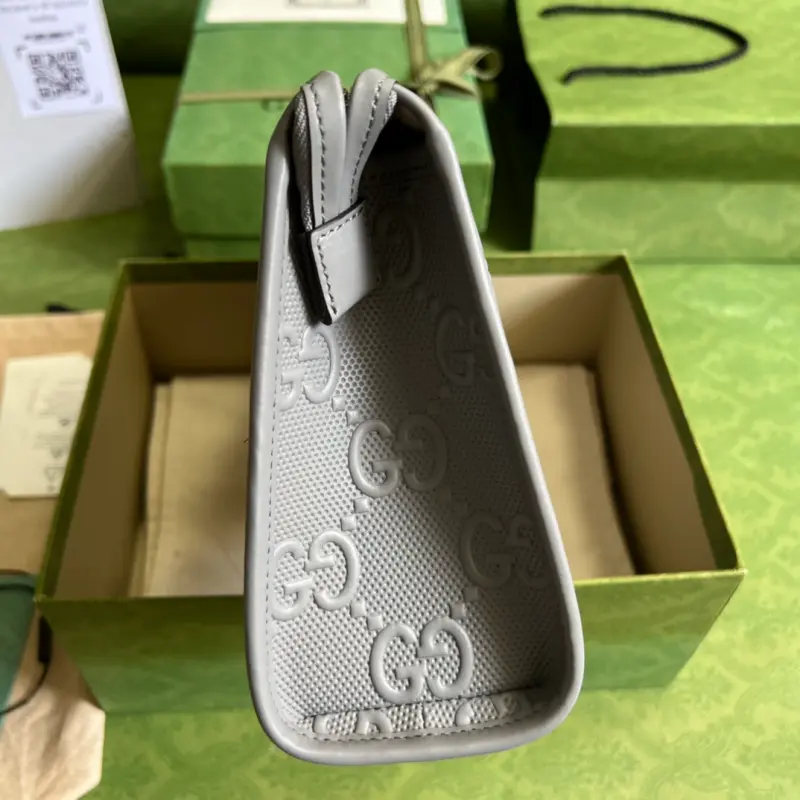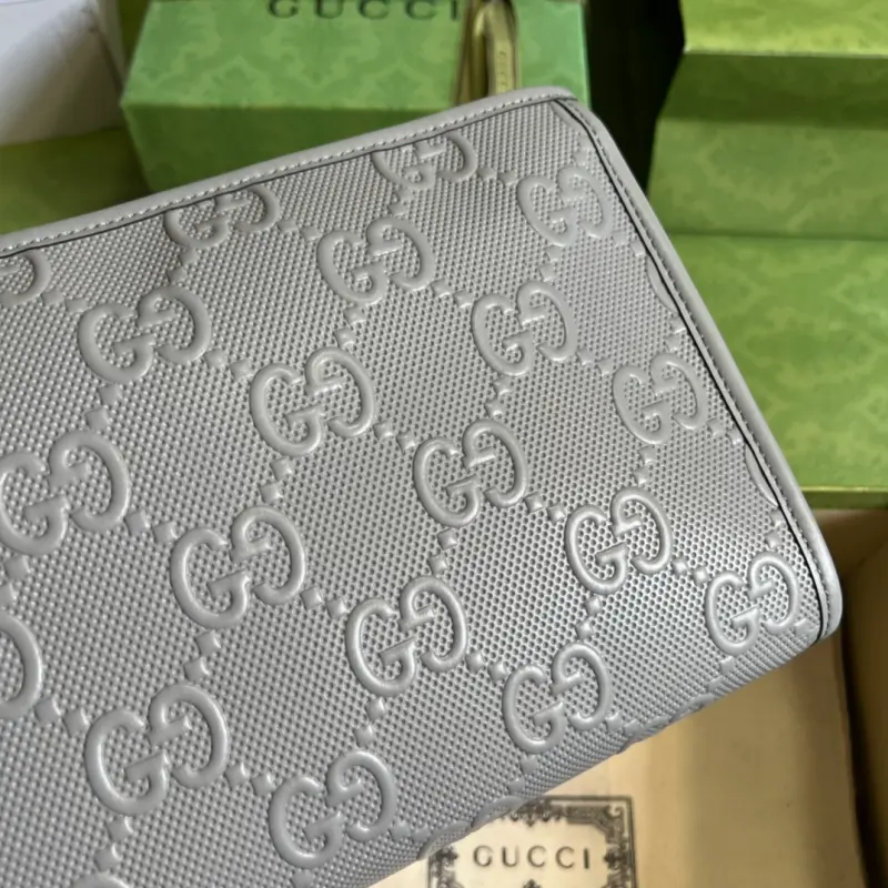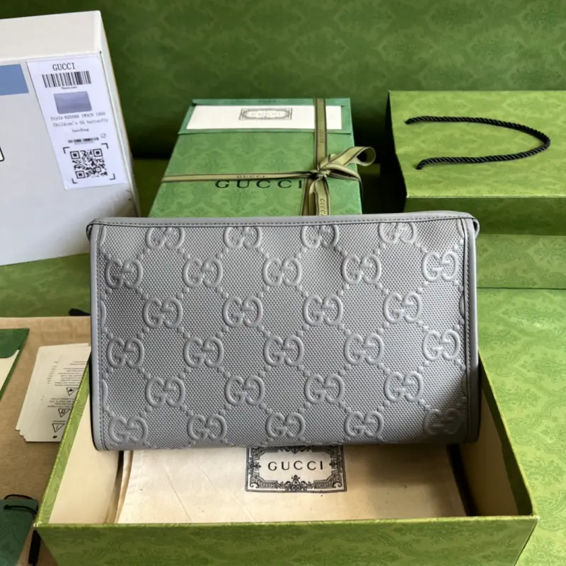 This GG-embossed zipper clutch features a new interpretation of the GG pattern from the Early Fall 2020 collection. The soft, slightly lustrous GG leather is cleverly blended with the texture and embossed brand logo on the gray perforated leather, highlighting the exceptional design quality. The slender zipper design complements the detachable wrist strap. This gray GG-embossed leather is crafted from metal-free and chrome-free tanned leather. The leather used in this product is made using an alternative metal-free or chrome-free tanning process, which reduces the environmental footprint compared to traditional methods. Model No. 625568. Dimensions: 28.5*18*9cm. Color: Gray/Embossed Full Leather.