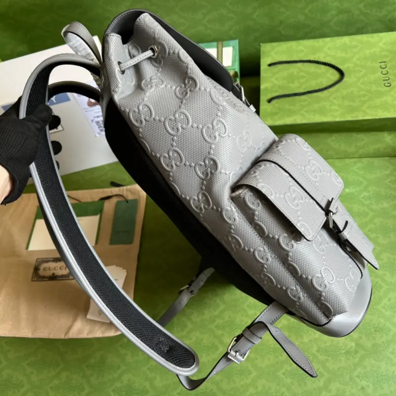 [Comes with a full set of original green gift bags] GG printed embossed backpack, GG leather cleverly uses textures, combining soft texture with all-over brand logo print embossing, and the slightly radiant sheen makes the material more high-end. This backpack is made of a modern and fashionable gray material and is equipped with a padded shoulder strap. Gray GG printed embossed leather, cotton and linen lining, exterior: 2 side pockets with buckles and magnetic buckles, interior: padded laptop compartment and 2 smartphone pockets, handle height 4.5 cm; adjustable shoulder strap with padded mesh padding, flap with buckle and magnetic buckle. Model: 625770. Dimensions: 34 (width) x 41″ (height) x 12cm (depth) Color: gray/embossed G full leather. Made in Italy