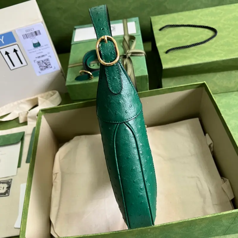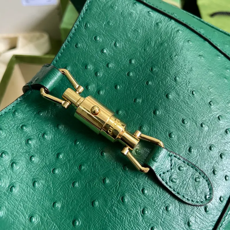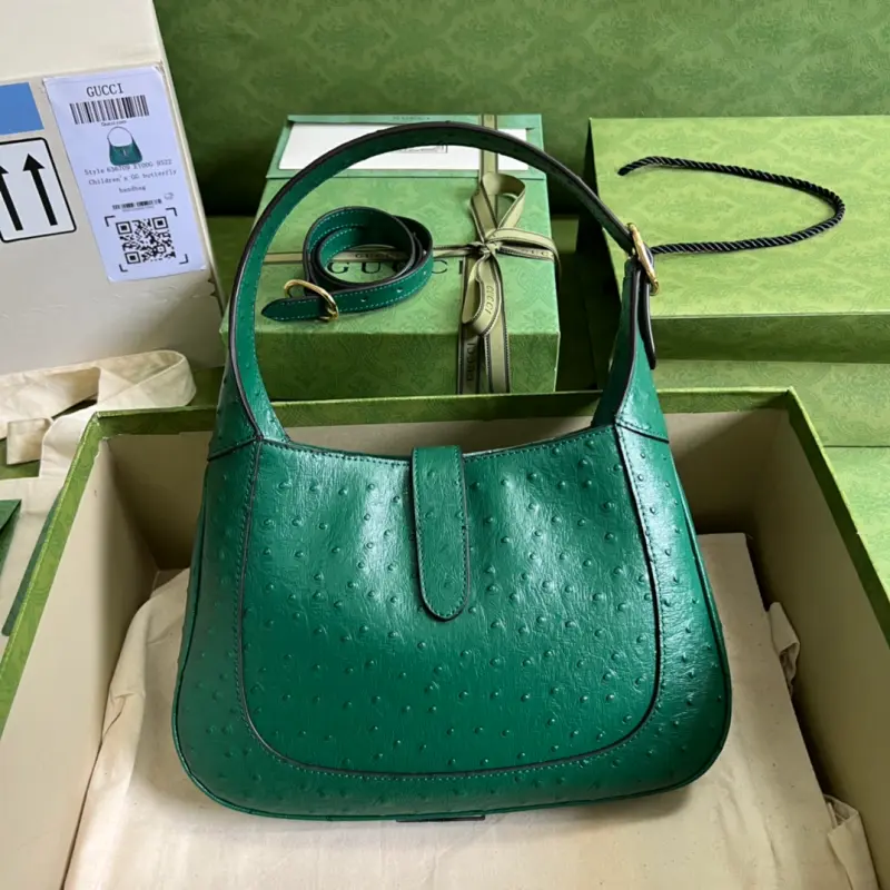 Comes with a complete set of original green packaging. The updated GG Jackie ostrich-print underarm bag. After six months of popularity, the Jackie continues to be incredibly popular. Major brands have released underarm bags, demonstrating just how popular this fashion trend has become. Underarm bags have been around since the last century and have remained a classic to this day. A GG underarm bag is a true icon, sure to drive you crazy. This is a must-have this year. Model: 636709. Dimensions: 28 x 19 x 4.5cm. Color: Green/Ostrich-print leather.