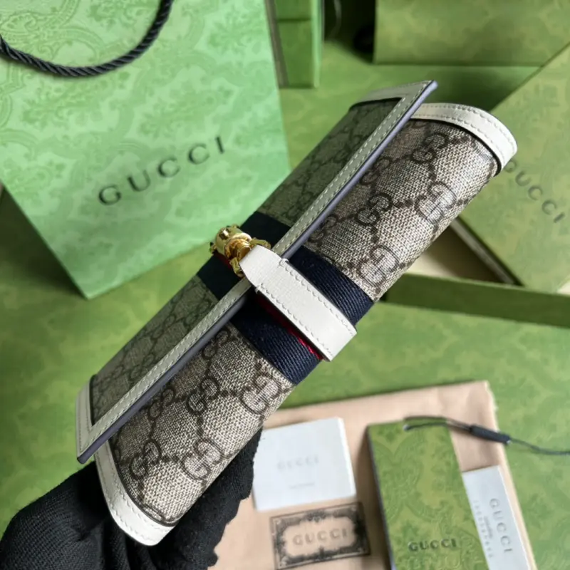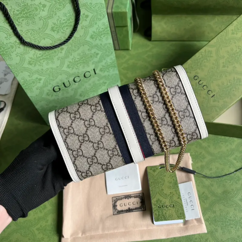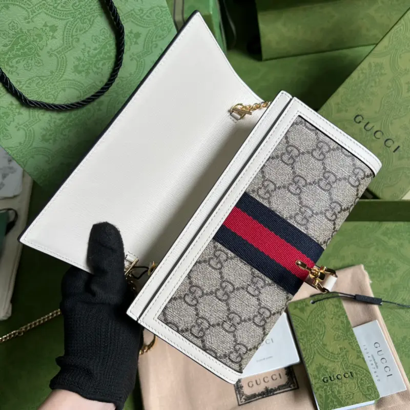 Jackie1961 introduces a new, compact and elegant chain bag. The gold-toned push-lock clasp, detachable chain, and classic double-G interwoven denim fabric exude a timeless elegance. Model: 652681. Dimensions: 19 x 10 x 3.5 cm. Color: White/PVC