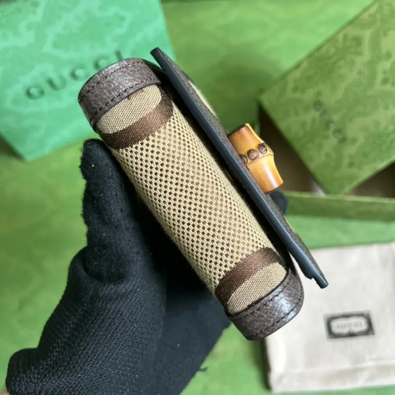 This original leather bamboo wallet from Gbag’s “Aria” collection, featuring a modern interpretation of a classic, comes with a modern twist. The bamboo design is a Gbag signature, appearing in various collections since the 1940s. After more than eight decades of evolution, this classic element is reimagined with black leather. The bag also features two interchangeable shoulder straps: a smooth leather strap for an elegant and timeless look, and a striped webbing strap for a strong brand identity. Model No. 658635. Dimensions: 11 x 10 x 3 cm. Color: Brown/Canvas.