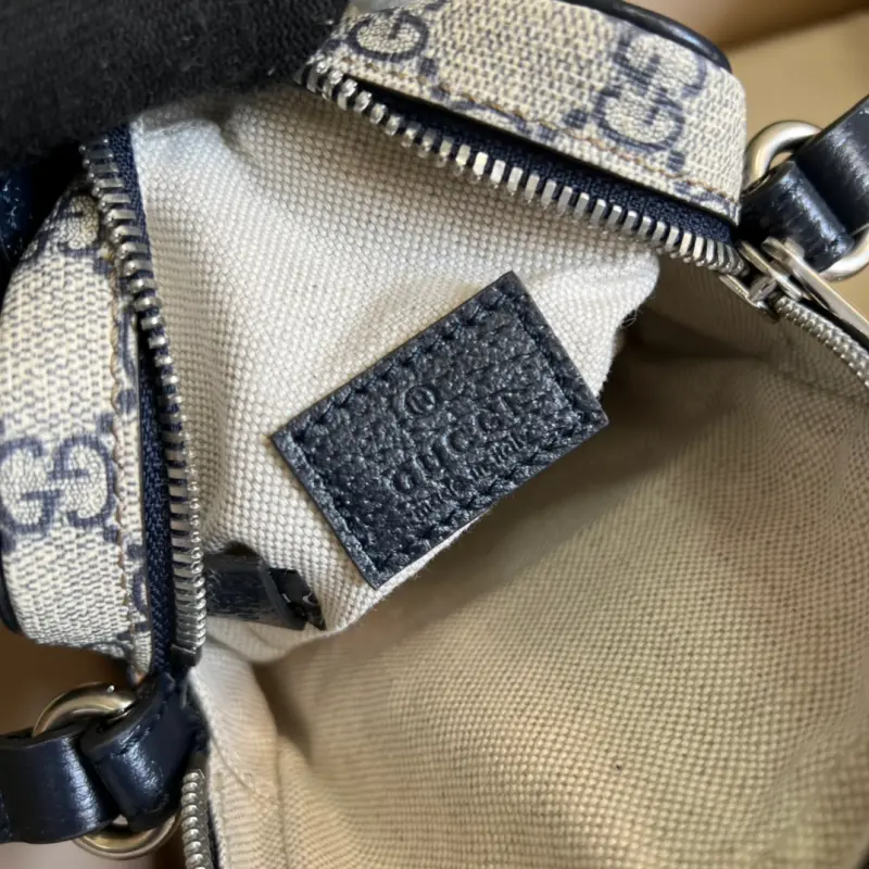This Gbag Meo Vintage small bag, complete with original green packaging, stands out from the Boundless Overture collection, infusing vintage style with modern design. The mini bag features an oval leather label and the brand’s signature feline head. It embodies all the brand’s classic elements, creating a versatile and adorable look that’s both classic and vintage. Model No. 671682. Dimensions: 12*16*7cm. Color: Blue/PVC.