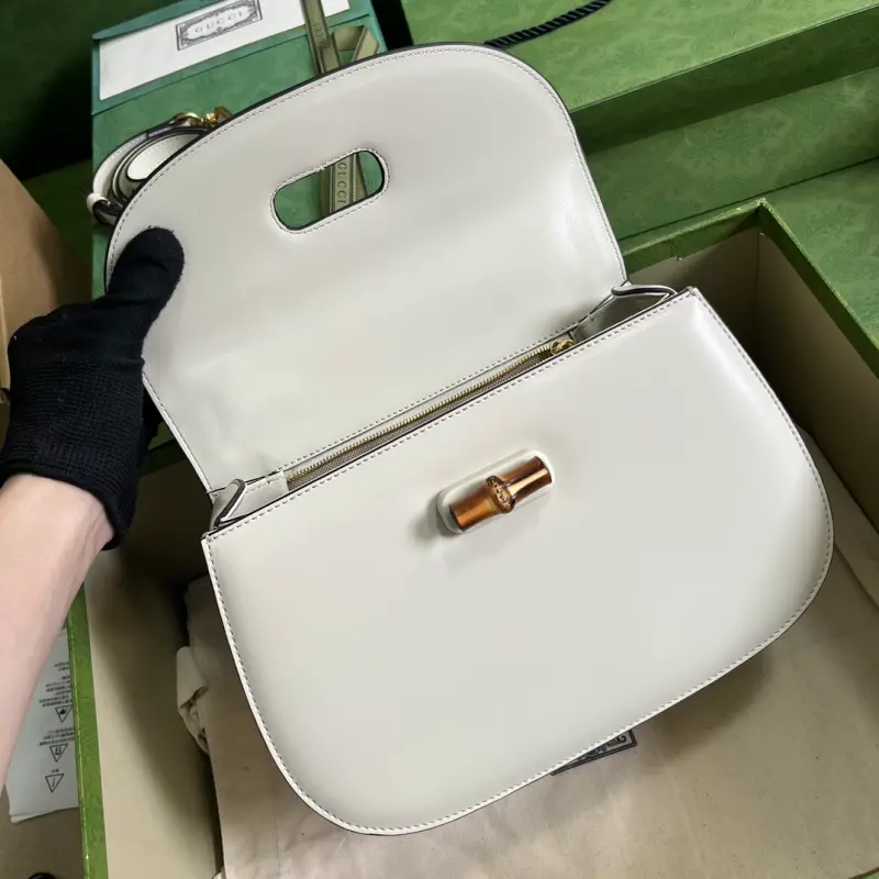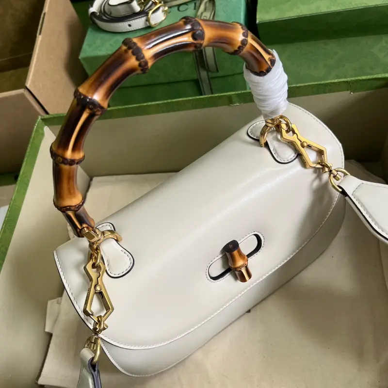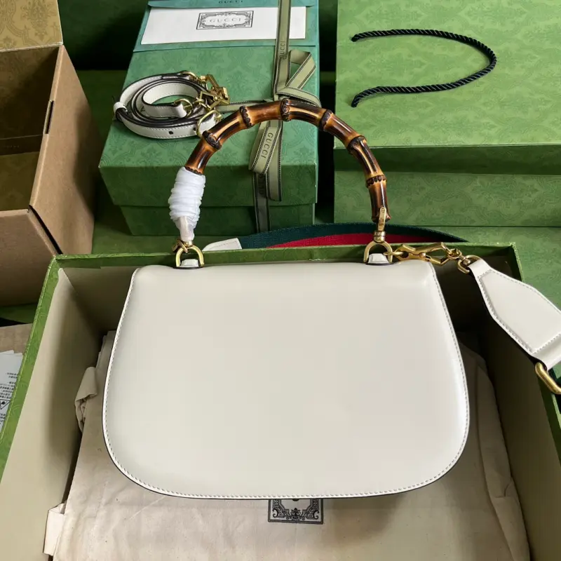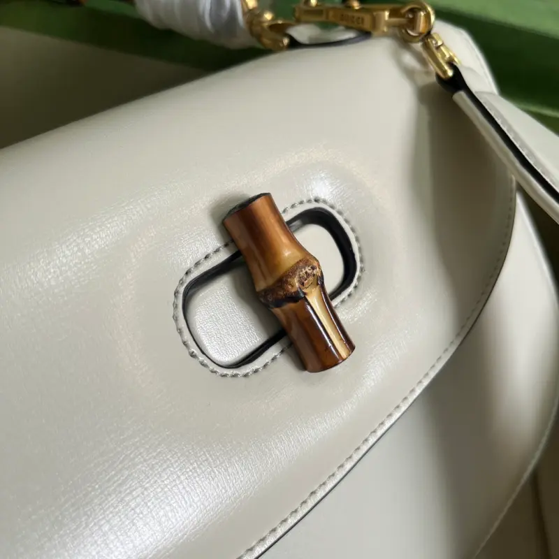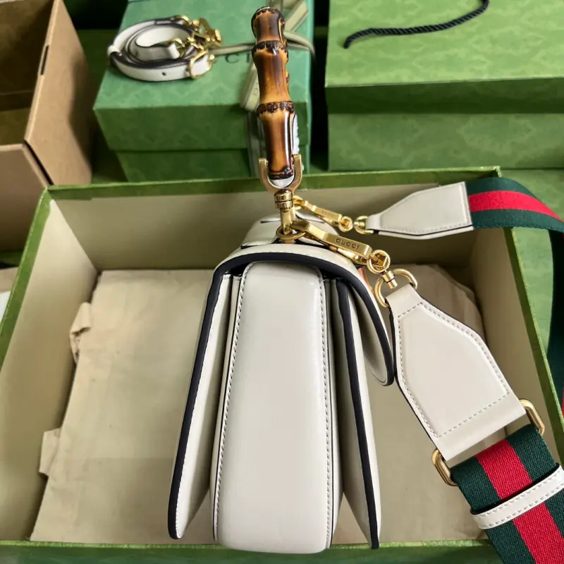 The Gbag Bamboo 1947 medium handbag, part of Gbag’s “Aria” collection, offers a modern take on a classic. Bamboo, a Gbag signature, has been featured in various collections since the 1940s. After more than eight decades of evolution, this classic element is reimagined in white leather. The bag features two interchangeable shoulder straps: a smooth leather strap for an elegant and timeless look, and a striped web strap for a strong brand identity. The bag features white leather with antique gold-tone bamboo hardware, two detachable shoulder straps: red and green web, white leather, and cotton and linen lining. The interior includes one zippered pocket and one open pocket with a mirror. Handle drop: 14 cm, shoulder strap drop: 50 cm. Weight: approximately 1.96 kg. Model No. 672206. Dimensions: 26 (W) x 17 (H) x 9 cm (D) Color: White / Original leather. Made in Italy