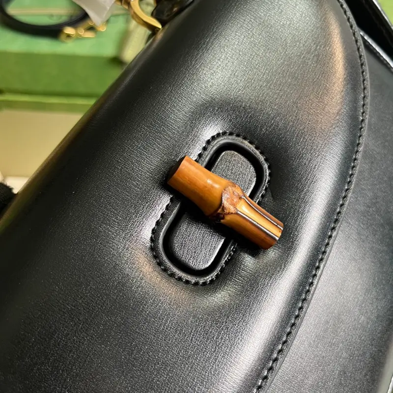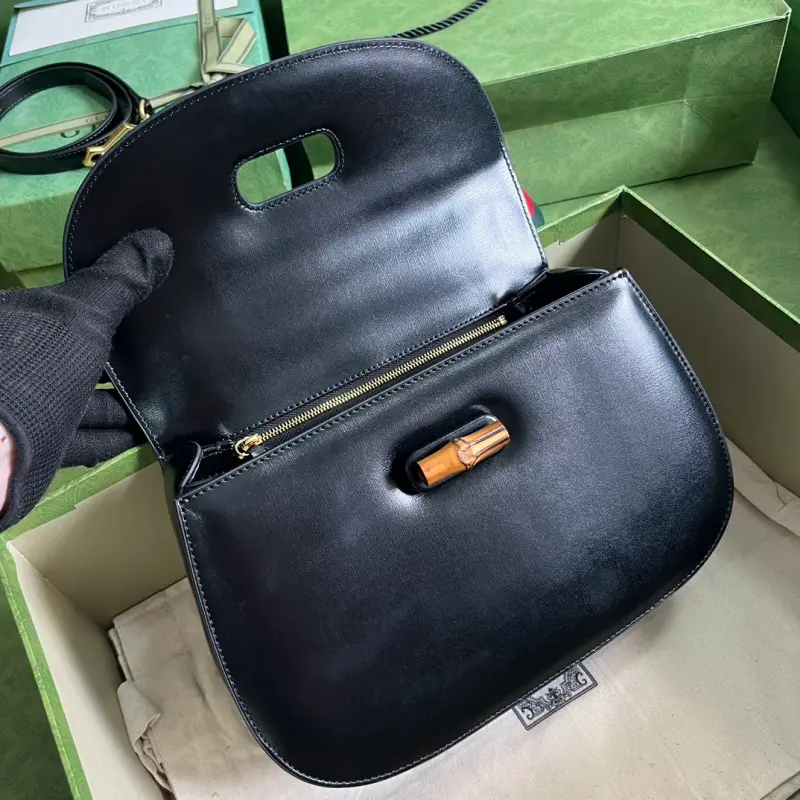 The Gbag Bamboo 1947 medium handbag, part of Gbag’s “Aria” collection, offers a modern take on a classic. Bamboo, a Gbag signature, has been featured in various collections since the 1940s. After more than eight decades of evolution, this classic element is reimagined in black leather. The bag features two interchangeable shoulder straps: a smooth leather strap for an elegant and timeless look, and a striped web strap for a strong brand identity. The bag features black leather with antique gold-tone bamboo hardware, two detachable shoulder straps: red and green web, black leather, and cotton and linen lining. The interior includes one zippered pocket and one open pocket with a mirror. Handle drop: 14 cm, strap drop: 50 cm. Weight: approximately 1.96 kg. Model No. 672206. Dimensions: 26 (W) x 17 (H) x 9 cm (D) Color: Black / Original leather. Made in Italy