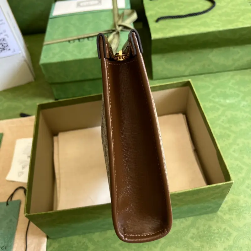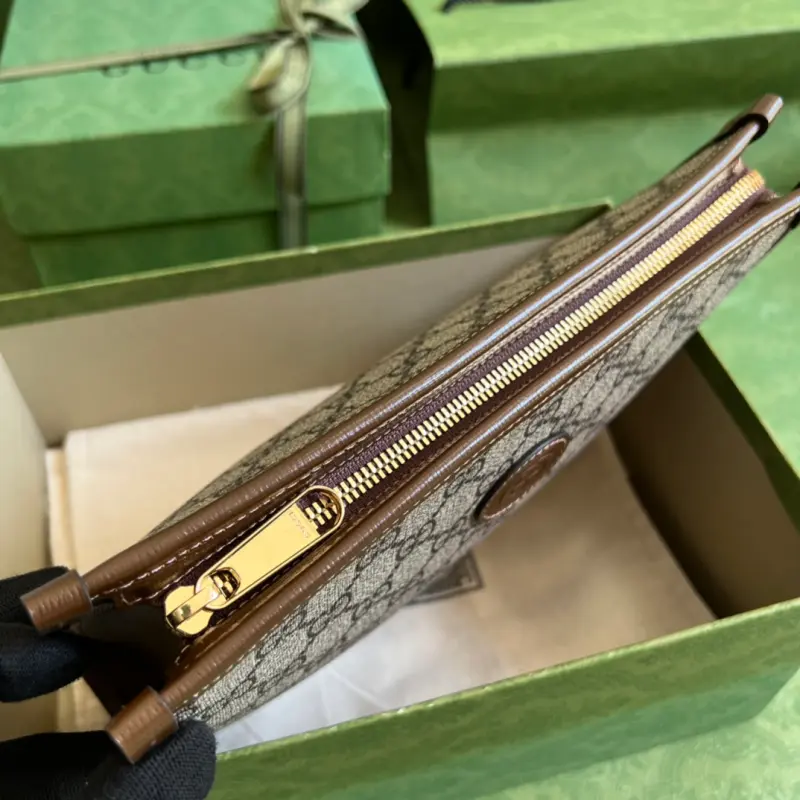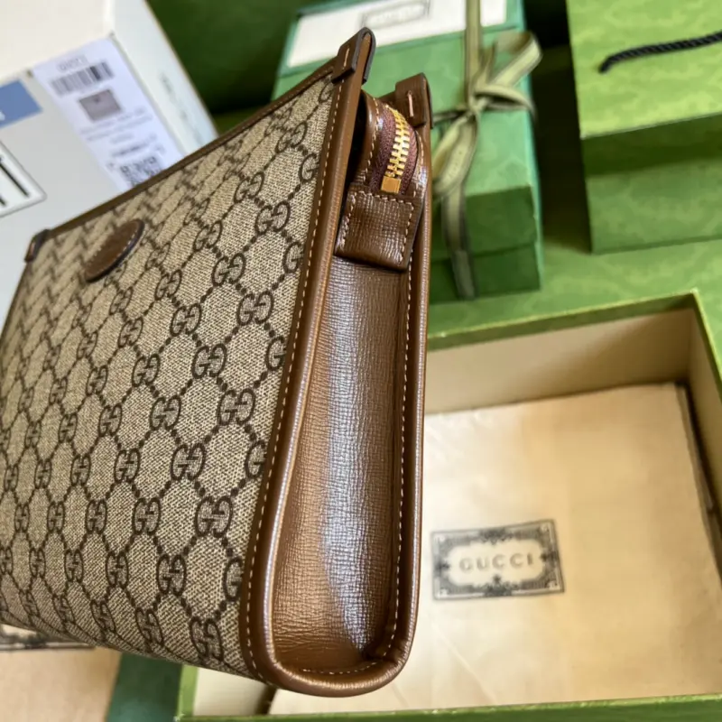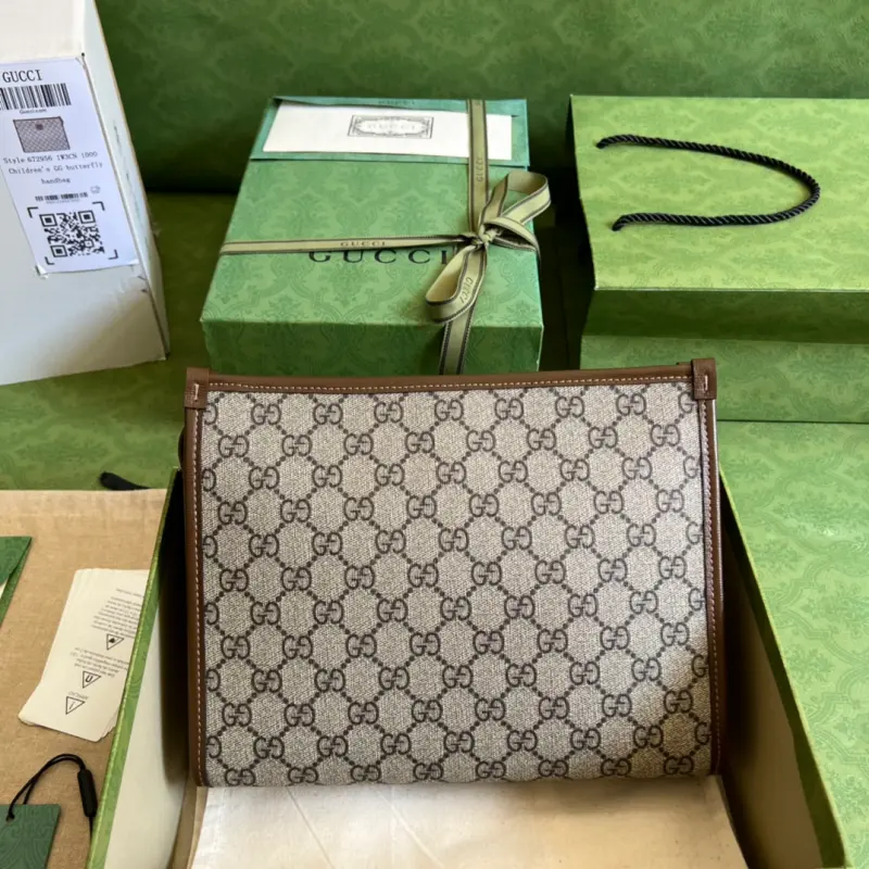 This new clutch is crafted from brown GG Supreme canvas, accented with tonal leather trim and an Interlocking G logo, showcasing the allure of a timeless design. Made of brown GG Supreme canvas, a sustainable material. Brown leather trim. Viscose lining. Oval Interlocking G leather logo. Removable handle. Dimensions: 26 x 20 x 6 cm. Color: Brown/PVC. Model No. 672956.