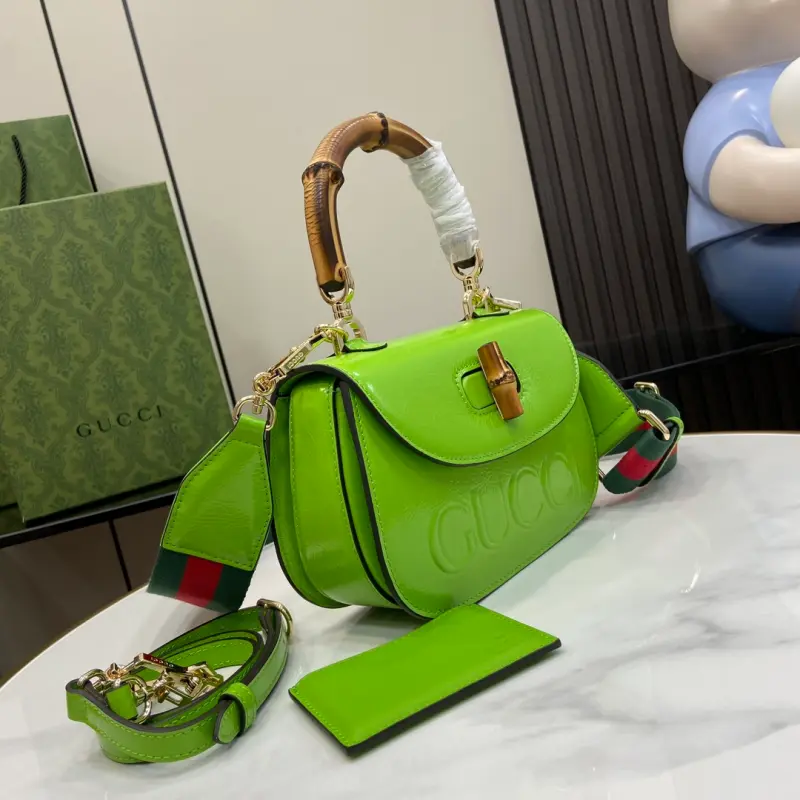 [Includes full original green box packaging] [New Arrival] Gbag Bamboo 1947 Small Bamboo Handbag. Gbag Bamboo 1947 handbags feature distinctive design elements such as handcrafted bamboo handles, a lock, and a mirror enclosed in a leather mirror case, showcasing the brand’s timeless style and exquisite craftsmanship. Visit selected stores or experience exclusive shopping with the assistance of a Customer Advisor. Green patent leather with gold-tone bamboo hardware and leather lining. Interior: one zipper pocket; one open pocket with mirror. Web strap drop: 81 to 125 cm; leather strap drop: 99 to 111 cm. Bamboo handles (11 cm drop). Web strap drop: 41 to 64 cm; leather strap drop: 50 to 58 cm. Bamboo lock closure. Weight: approximately 0.9 kg. Model No. 675797. Dimensions: 15 (L) x 21 (W) x 7 cm (D) Color: Green patent leather / original leather. Made in Italy