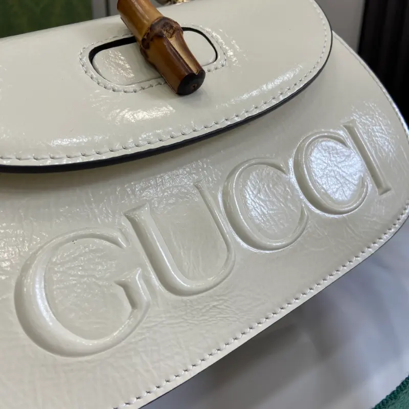 [Includes full original green box packaging] [New Arrival] Gbag Bamboo 1947 Small Bamboo Handbag. Gbag Bamboo 1947 handbags feature distinctive design elements such as handcrafted bamboo handles, a lock, and a mirror enclosed in a leather mirror case, showcasing the brand’s timeless style and exquisite craftsmanship. Visit selected stores or experience exclusive shopping with the assistance of a Customer Advisor. White patent leather with gold-tone bamboo hardware and leather lining. Interior: one zipper pocket; one open pocket with mirror. Web strap drop: 81 to 125 cm; leather strap drop: 99 to 111 cm. Bamboo handles (11 cm drop). Web strap drop: 41 to 64 cm; leather strap drop: 50 to 58 cm. Bamboo lock closure. Weight: approximately 0.9 kg. Model No. 675797. Dimensions: 15 (L) x 21 (W) x 7 cm (D) Color: White patent leather / original leather. Made in Italy
