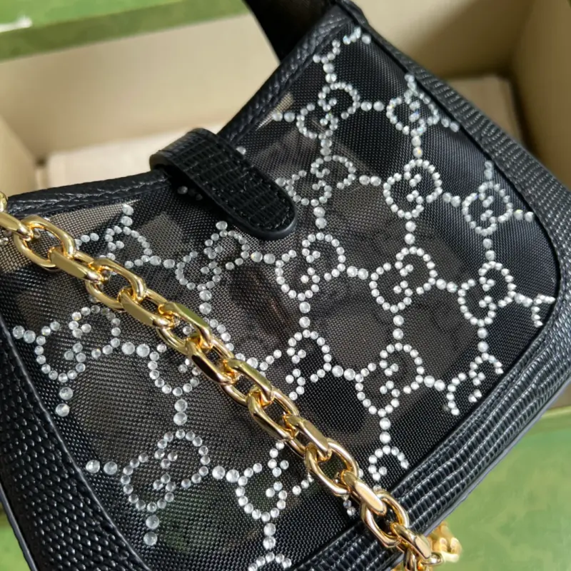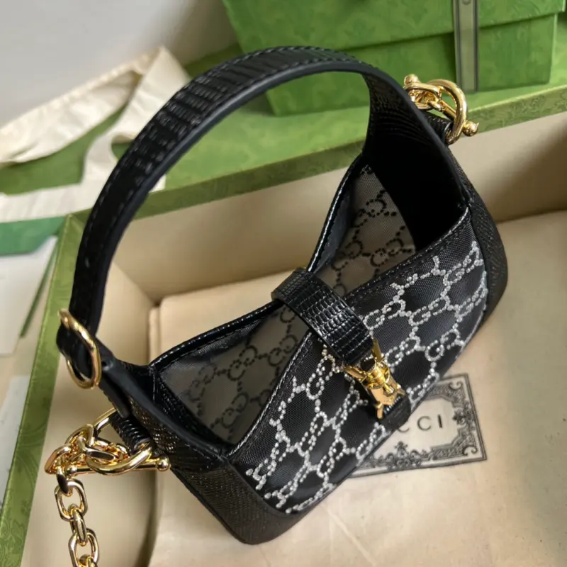 “Comes with a full set of original green box packaging” Introduction: “Aria – Fashion Aria” Jackie 1961 series introduces a new rectangular tote bag with a soft texture and flexible structure. The series’ signature gold-toned push-lock hardware. The gleaming rhinestones and the noble lizard leather are a perfect match! The hollow design adds a sense of fashion. The materials are counter-quality rhinestones and imported lizard leather. The matching hardware is polished to make the patterns clear and easy to see, and the texture is delicate and of the highest quality! Model: 677027. Size: 19x13x3cm. Color: Black/Lizard leather rhinestones