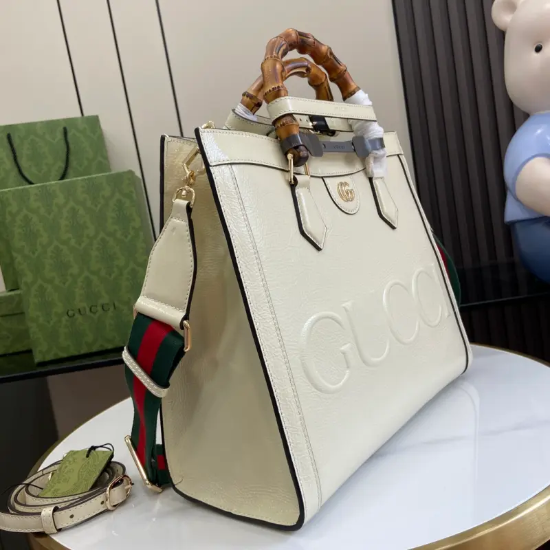 [Includes full original green box packaging] [New Arrival] GG Original Leather Bamboo Large Handbag. Gbag’s “Aria” collection offers a modern take on a classic. Bamboo is a Gbag signature, appearing in various collections since the 1940s. After more than eight decades of evolution, this classic element is reimagined in this small handbag, enhanced with white patent leather. The bag also features two interchangeable shoulder straps: a smooth leather strap for an elegant and timeless look, and a striped webbing strap for a strong brand identity. Model No. 678842. Dimensions: 35*30*14cm. Color: White/Original Patent Leather.