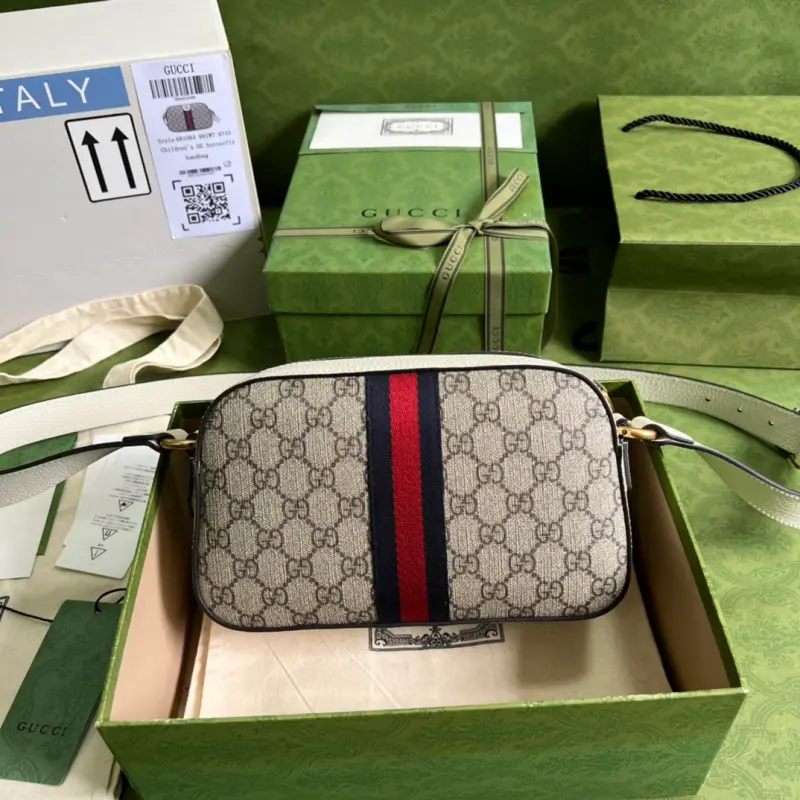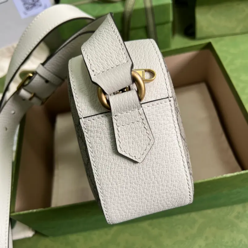 The Gbag Meo Vintage camera bag, complete with original green packaging, stands out from the Gbag Infinity Prelude collection, infusing retro style with modern design. The mini bag features an oval leather tag and the brand’s signature feline head. This embodies all the brand’s classic elements, creating a versatile and adorable look. Model: 681064. Dimensions: 21 x 14 x 7 cm. Color: White/PVC