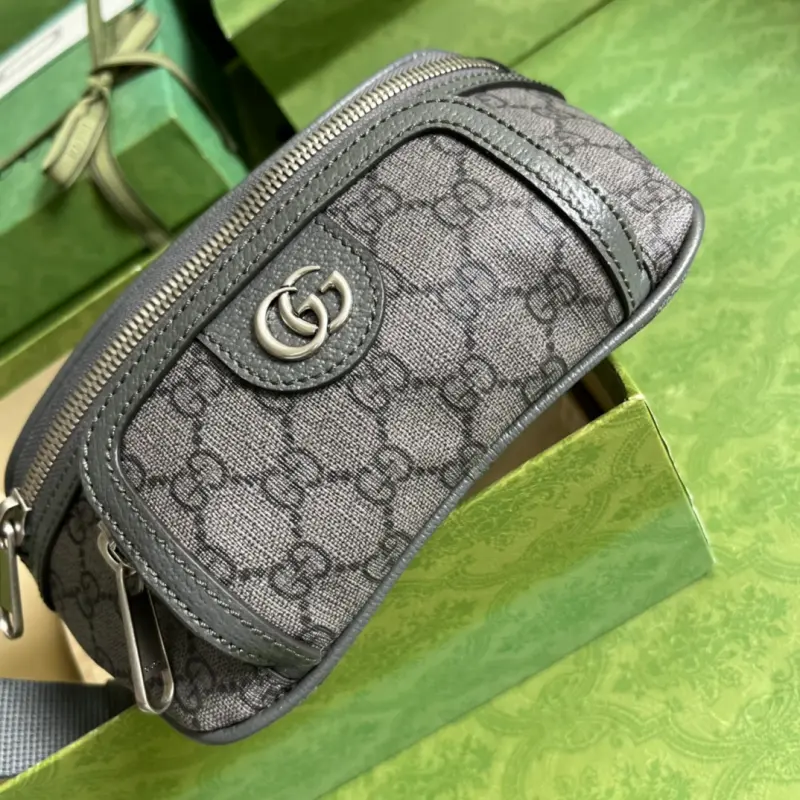 This Ophidia belt bag, complete with original green box packaging, combines the iconic Double G detail with a gray and black GG Supreme canvas, a timeless homage to the Gbag brand’s roots. This accessory echoes the enduring vintage spirit of the Ophidia collection. It features a gray and black GG Supreme canvas with gray leather trim, palladium-tone Double G hardware, and a zipper closure. Model No. 682933. Dimensions: 23cm (width) x 12cm (height) x 2.5cm (depth). Color: Gray/PVC.