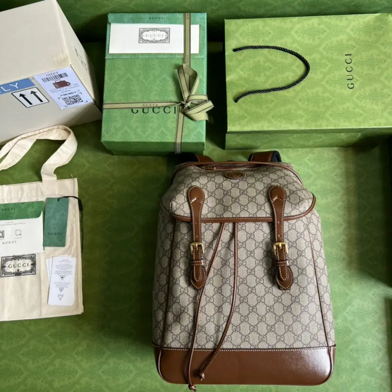 [Includes full original green box packaging] A medium backpack with brown Interlocking GG motifs. Since its inception, the Interlocking G has been a signature element of the Gbag brand. This highly recognizable element is featured in leather details on this backpack, a subtle nod to Gbago Gbag’s founder. The modern black GG Supreme canvas and black leather trims harmoniously blend to further emphasize the brand’s signature design. Hide details: GG Supreme canvas, a sustainable material, with a cotton and linen lining and an oval leather Interlocking G plaque. Interior: one padded laptop compartment and one zippered pocket. Exterior: one zippered pocket on the flap. Padded back and shoulder straps, flap and buckle closure. Model No. 696013. Dimensions: 26cm (width) x 43cm (height) x 18cm (depth). Color: Brown/PVC.