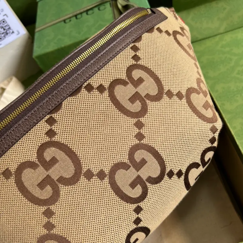 Original green box packaging. First debuting in the Aria collection, this oversized version of the classic GG motif returns this season on iconic travel luggage, showcasing the brand’s signature charm in a high-profile manner. This belt bag features the brand’s signature red and green Web, a modern take on Gbag’s iconic belt buckle from the 1970s. Crafted in camel and ebony Super G canvas with brown leather trim. Model No. 696031. Dimensions: 39 x 17 x 4 cm. Color: Brown/Big G canvas. Made in Italy.