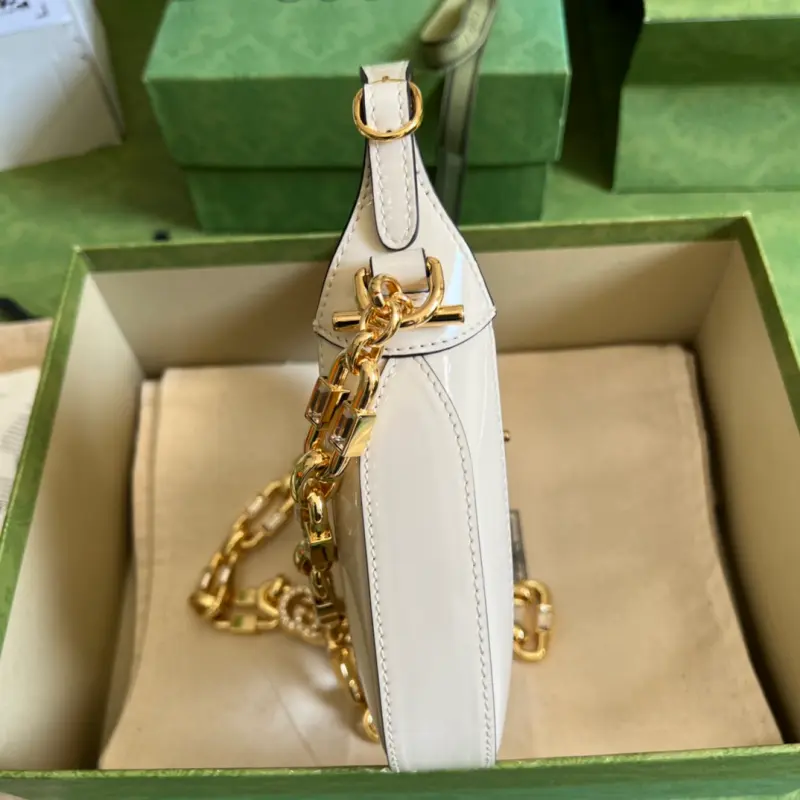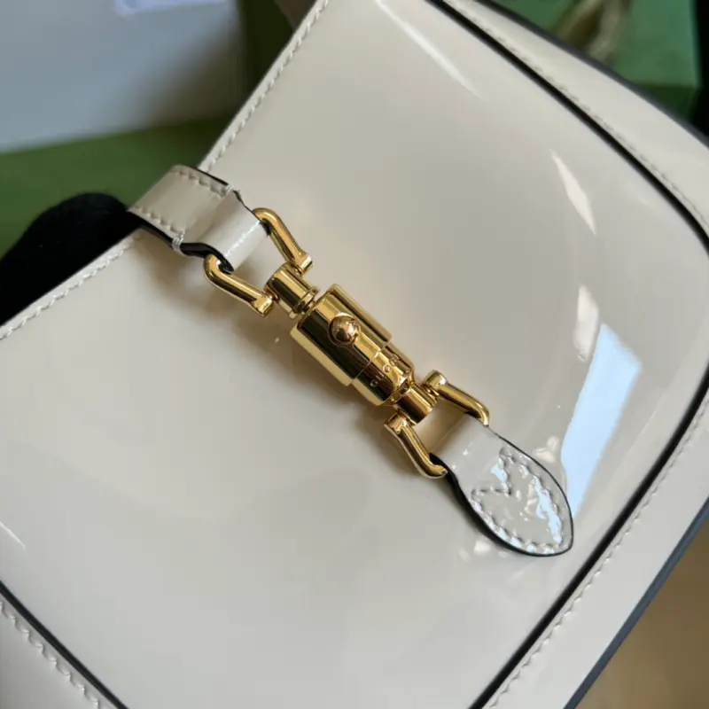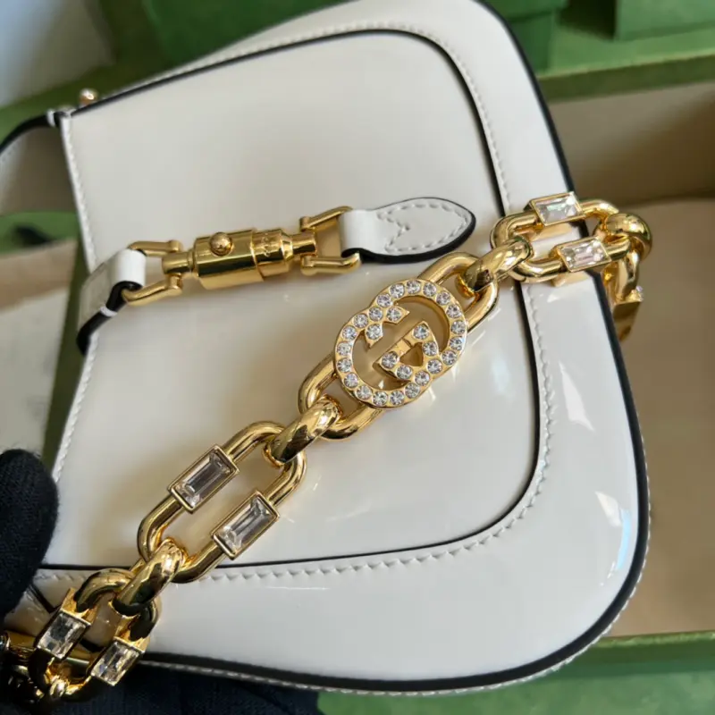[Comes with a full set of original green box packaging] Jackie 1961 series mini shoulder bag, this piece is made of dazzling patent leather, playful yet sophisticated. This Jackie 1961 series mini handbag interprets this highly lustrous material in bright white, adding another fashionable masterpiece to “Gbag Love March”. The bold color scheme echoes the concept of self-expression in this season’s fashion show. White patent leather, gold-tone hardware, handle height: 10 cm, crystal interlocking double G detachable chain shoulder strap (40 cm high), push-in lock. Model: 699651. Mini size: 19 (width) x 13 (height) x 3cm (depth) Color: white/patent leather. Made in Italy