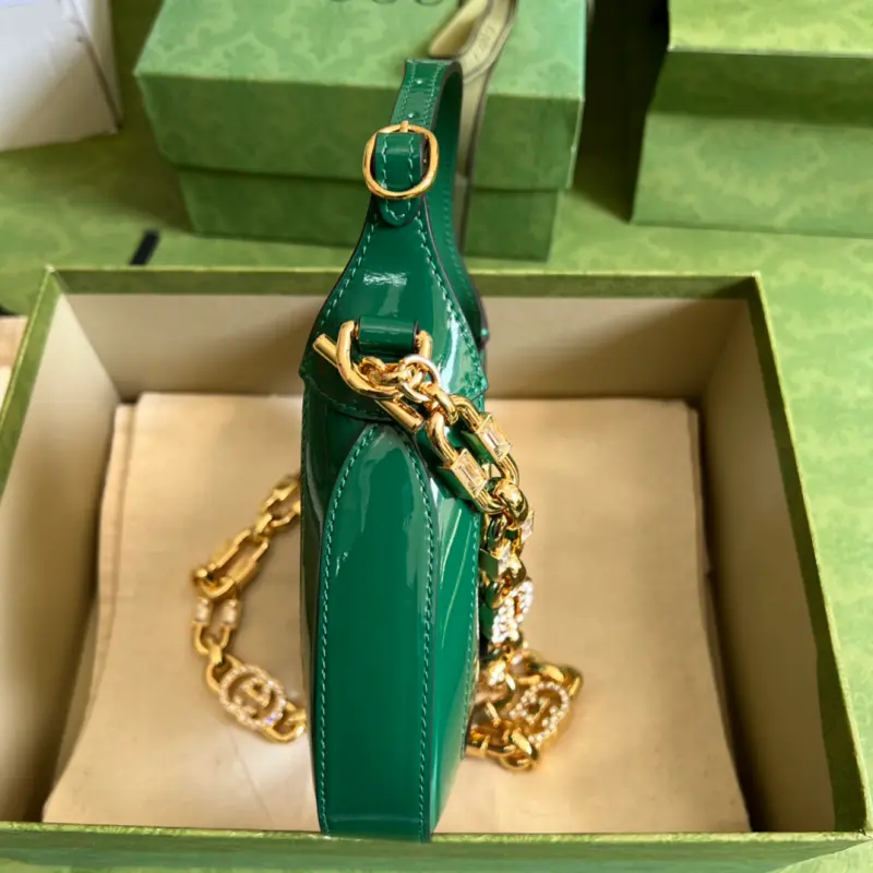 [Comes with a full set of original green box packaging] Jackie 1961 series mini shoulder bag, this piece is made of dazzling patent leather, playful yet sophisticated. This Jackie 1961 series mini handbag interprets this highly lustrous material in bright white, adding another fashionable masterpiece to the “Gbag Love March”. The bold color scheme echoes the concept of self-expression in this season’s fashion show. Green patent leather, gold-tone hardware, handle height: 10 cm, crystal interlocking double G detachable chain shoulder strap (40 cm high), push-in lock. Model: 699651. Mini size: 19 (width) x 13 (height) x 3cm (depth) Color: Green/Patent Leather. Made in Italy