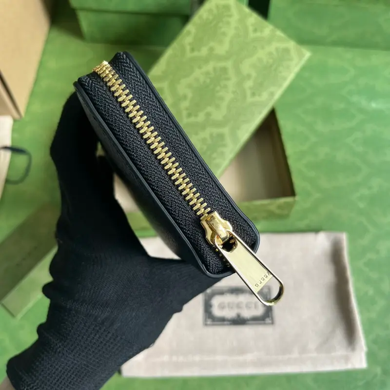 This GG Marmont wallet comes in a complete set of original green box packaging. Crafted from timeless black leather, this GG Marmont wallet is a classic addition to the Aria collection. The Double G design, inspired by 1970s belt buckles, is reimagined in tonal resin on this wallet. The classic design is combined with a monochromatic color scheme for a modern and stylish look. Model No. 700484. Dimensions: 19.5 x 11 x 3 cm. Color: Black/Original Leather.
