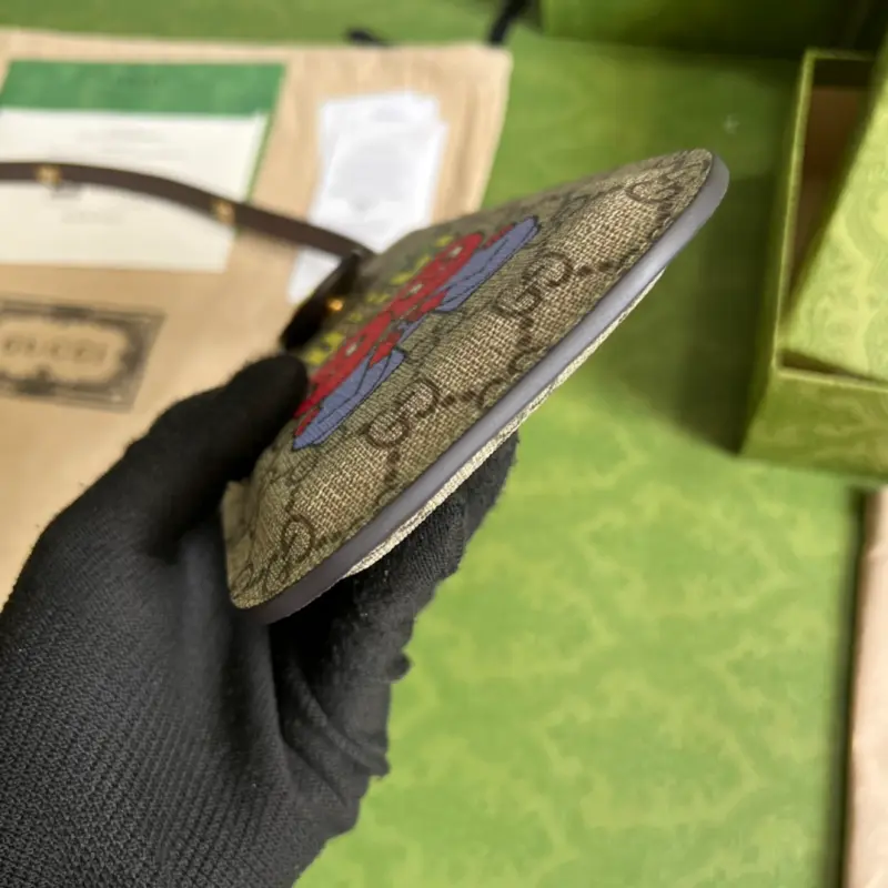 [Comes with full original green box packaging] Gbag cherry print mini phone bag. The work of Chilean cartoonist and illustrator Pablo Delcielo injects a touch of playful color into the “Gbag Love March” fashion series. Vibrant mythical creatures and fun fruit characters bring a whimsical and romantic atmosphere to ready-to-wear and accessories through bright and beautiful patches or prints. The exquisite cherry print is full of fun on this mini handbag. Brown and ebony GG Supreme canvas, an environmentally friendly material, brown leather piping, Gbag cherry print, the artistic creation of Pablo Delcielo. Model: 700732. Dimensions: 12 (W) x 18 (H). Color: Brown/PVC cherry print. Made in Italy