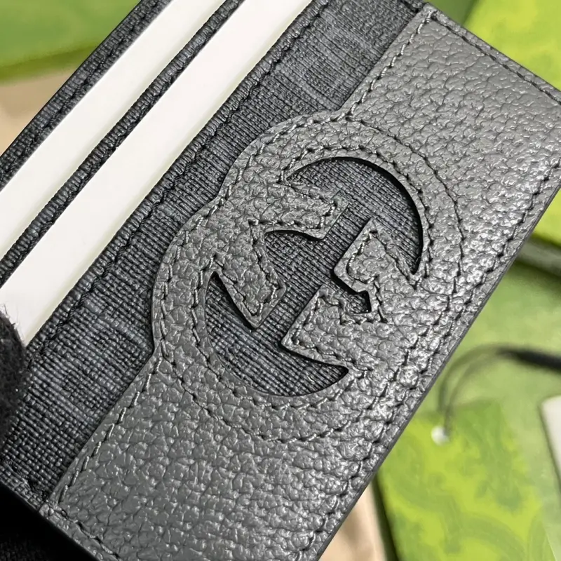 “Includes full original green box packaging” featuring a cutout Interlocking G card holder. Embellished with a cutout Interlocking G detail in leather, this card holder is cleverly paired with GG Supreme canvas, creating an accessory that embodies both modern style and timeless elegance. Since its creation in the 1960s, the iconic Interlocking G logo has been an integral design element throughout Gbag collections. Derived from the initials of Gbago Gbag, the logo has been continually reinvented in various forms and styles. Made of black and gray GG Supreme canvas with gray leather trim and a moir?? fabric lining, it features a cutout Interlocking G detail and four card slots. Model No. 701425. Dimensions: 10 cm (width) x 7 cm (height). Color: Gray leather/Black PVC.