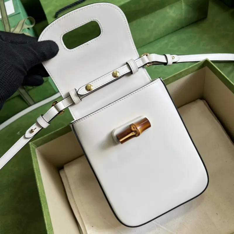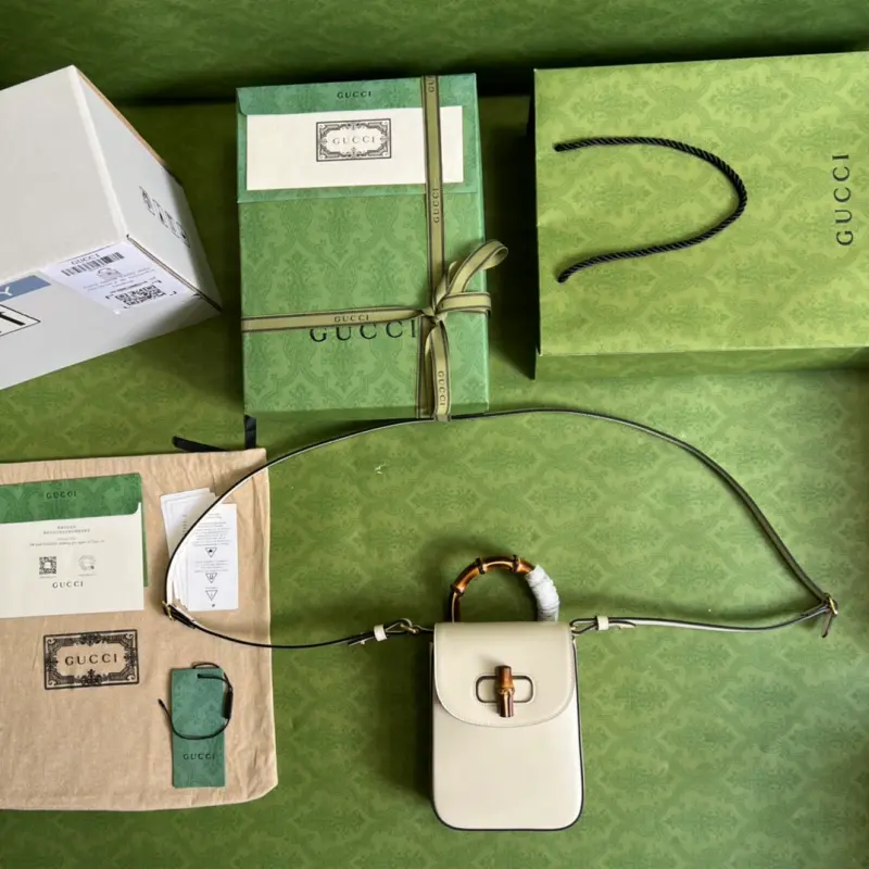 Comes with full original green box packaging. Description: The “March of Love” collection evokes the fashion trends of the ’90s. This bamboo handbag, meticulously crafted in leather, showcases the brand’s classic chic with its compact, signature bamboo handles and refined hardware. The detachable and adjustable shoulder strap allows it to be carried like a backpack or worn as a classic tote, allowing for a variety of styles and looks. Model No. 702106. Dimensions: 14 x 16 x 4 cm. Color: White/original leather.