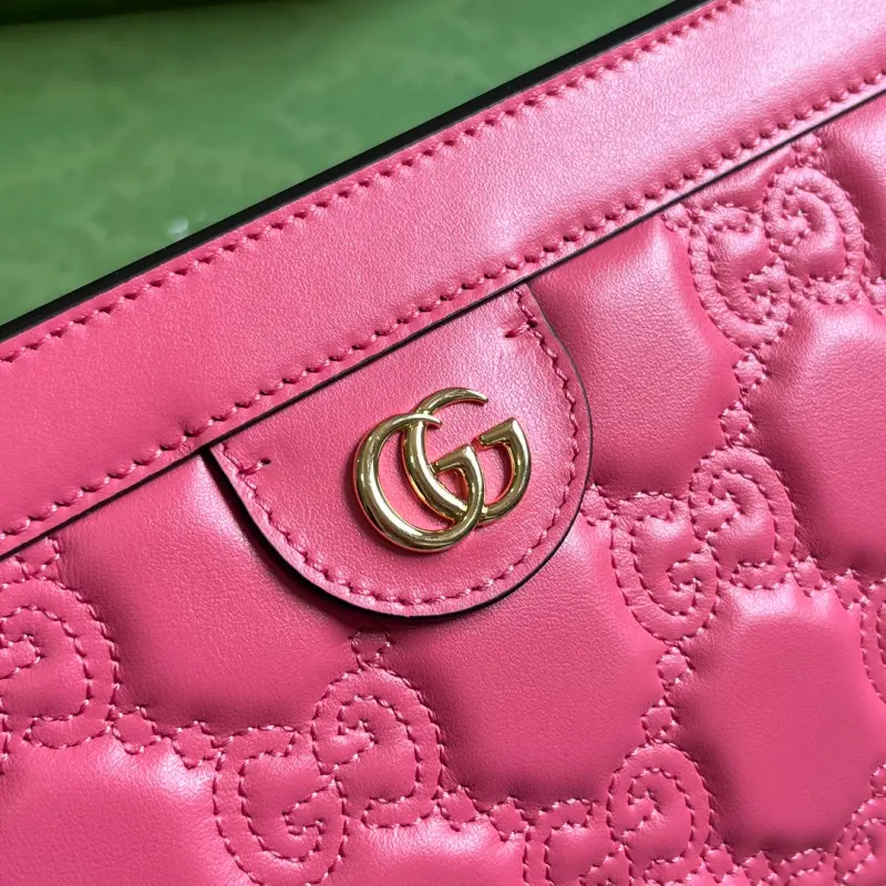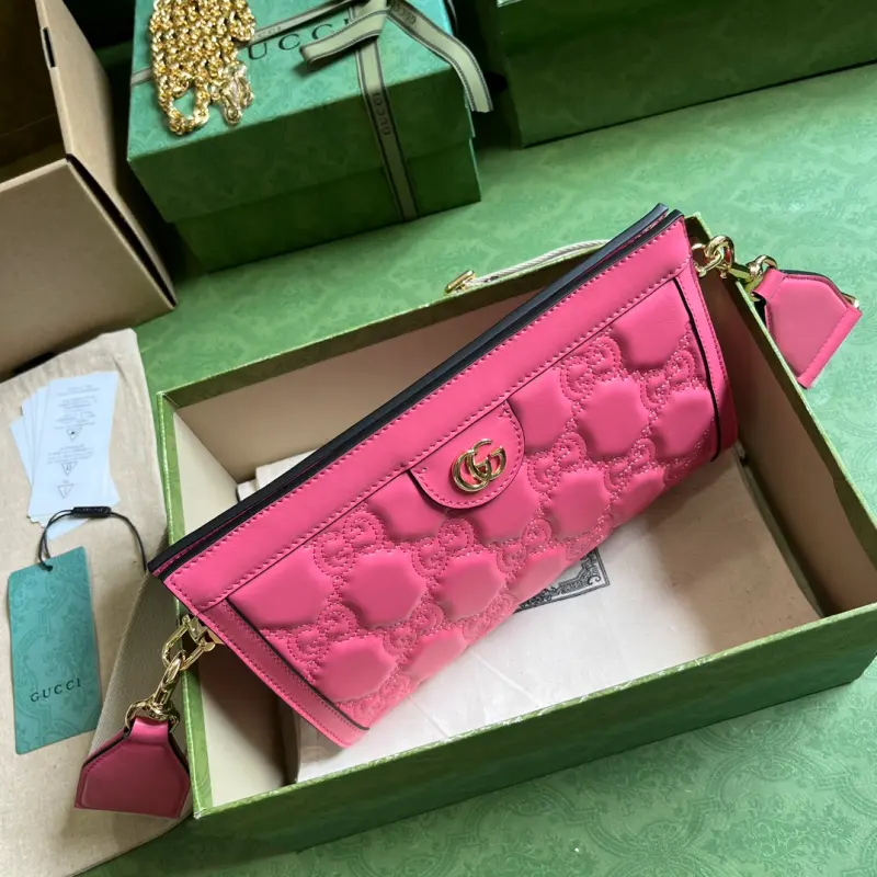 The GG matelass?? leather shoulder bag UM8HG 1046, which comes with a complete set of original green box packaging, continues to stand out in its own unique way. With its ultra-soft finish, the iconic material is once again reimagined as part of the Gbag Love Parade, featuring a textured geometric pattern. The design presents a contemporary take on the ’90s logo trend, which has appeared in the House’s latest collections. Here, it appears in a minimalist rose-pink shade. Made of rose-pink GG matelass?? leather with gold-tone Double G hardware. Model No. 702200. Dimensions: 26*17.5*8cm. Color: Rose-pink/Original G embossed leather.