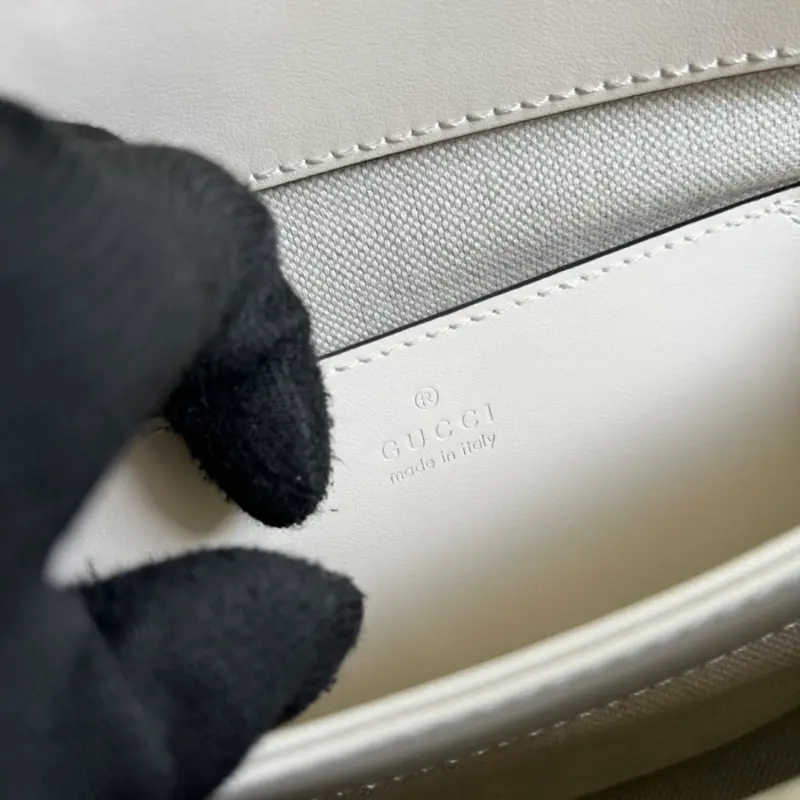 The GG matelass?? leather shoulder bag UM8HG 1046, which comes with a complete set of original green box packaging, continues to stand out with its unique style. With its ultra-soft finish, the iconic material is once again reimagined as part of the Gbag Love Parade, featuring a textured geometric pattern. The design presents a contemporary take on the ’90s logo trend, which has appeared in the House’s latest collections. Here, it appears in a minimalist shade of black. Made of white GG matelass?? leather with gold Double G hardware. Model No. 702200. Dimensions: 26*17.5*8cm. Color: White/GG embossed leather.