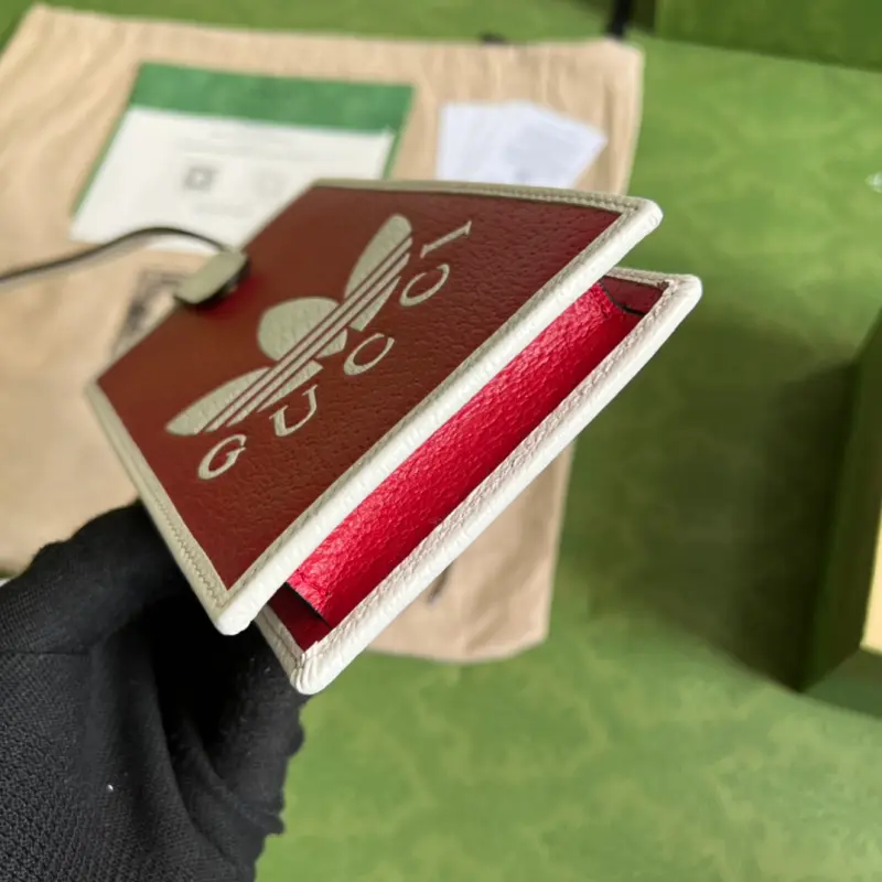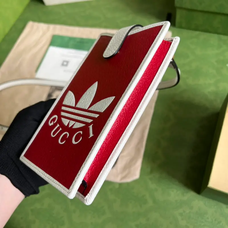 As part of the ad GG collaboration, the 1955 mini crossbody handbag features a Trefoil print. Blending the rich and historic heritage of both brands, the adidas x Gbag collaboration celebrates the brand’s history and iconic design language through a three-line design. Creative Director Alessandro Michele drew inspiration from the 1980s and 1990s, creating a collection that blends nostalgia with modern flair. Model: 702203. Dimensions: 10cm (width) x 17cm (height) x 2.5cm. Color: Red with full leather / adidas collaboration.