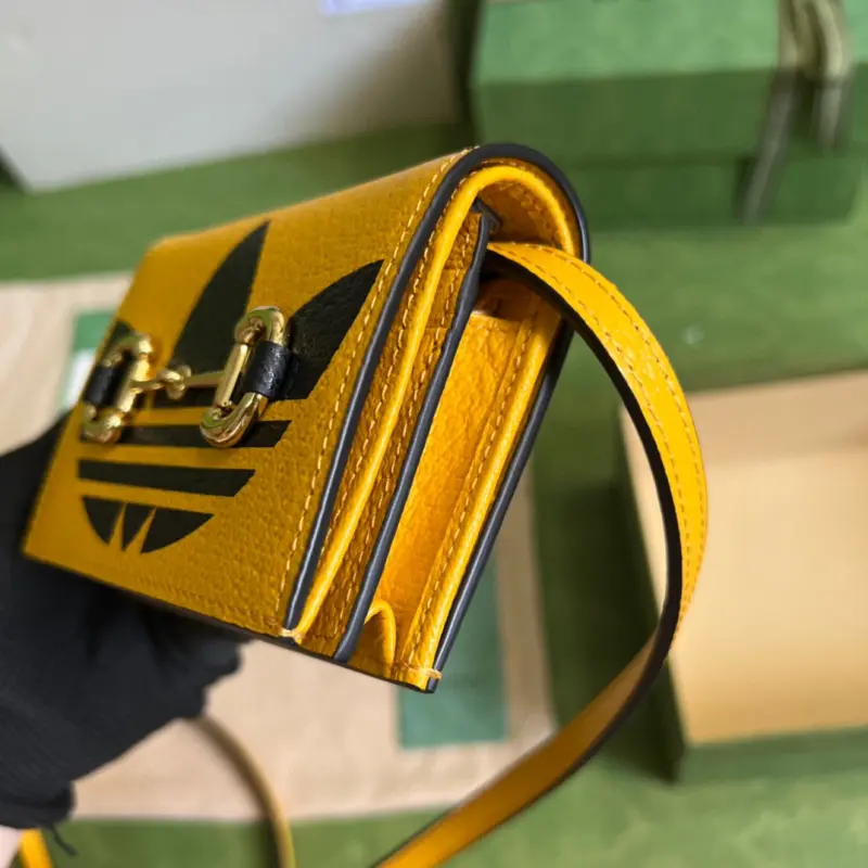 As part of the ad GG collaboration, the 1955 mini crossbody bag features a Trefoil print. Integrating the rich and historic heritage of both brands, the adidas x Gbag collaboration celebrates the brand’s history and iconic design language through a three-line design. Creative Director Alessandro Michele drew inspiration from the 1980s and 1990s, creating a collection that blends nostalgia with modern flair. Model No. 702248. Dimensions: 11cm (width) x 8.5cm (height) x 3cm.