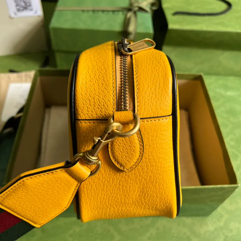 As part of the ad GG collaboration, the crossbody camera bag, “Comes with full original green box packaging,” features a Trefoil print. Blending the rich and historic heritage of both brands, the adidas x Gbag collaboration celebrates the brand’s history and iconic design language through a three-line design. Creative Director Alessandro Michele drew inspiration from the 1980s and 1990s, creating a collection that blends nostalgia with modern flair. Model No. 702427. Dimensions: 25 (width) x 16 (height) x 9.5 cm. Color: Yellow colorblock full leather / adidas collaboration.