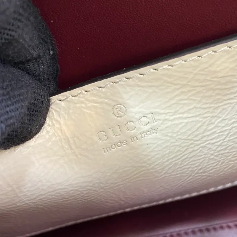 [Includes full original green box packaging] [New Arrival] Gbag Diana small tote bag. The black hue softens the Gbag Diana’s structured silhouette, creating a contrasting effect with the bamboo handles and web straps. The front is embellished with a printed and embossed brand name, adding an elegant touch. Made of white patent leather with Double G, shiny antique gold-tone hardware, and an embossed handwritten Gbag signature, this item features two decorative handle straps, a cotton and linen blend lining, an open interior pocket, and bamboo handles (7 cm drop). Web shoulder strap drop: 42-68 cm, leather shoulder strap drop: 48-55 cm, web shoulder strap drop: 87-138 cm, leather shoulder strap drop: 94-109 cm. Weight: Approximately 0.726 kg. Model No. 702721. Dimensions: 27 (W) x 24 (H) x 11 cm (D) Color: White / Patent leather Original leather. Made in Italy