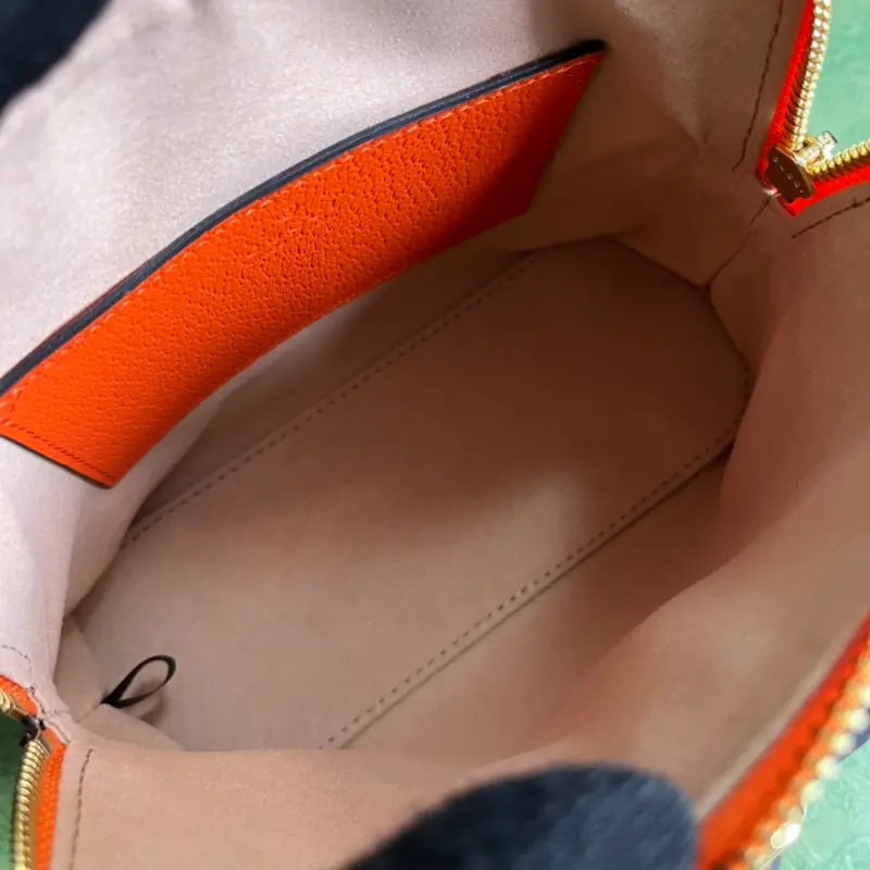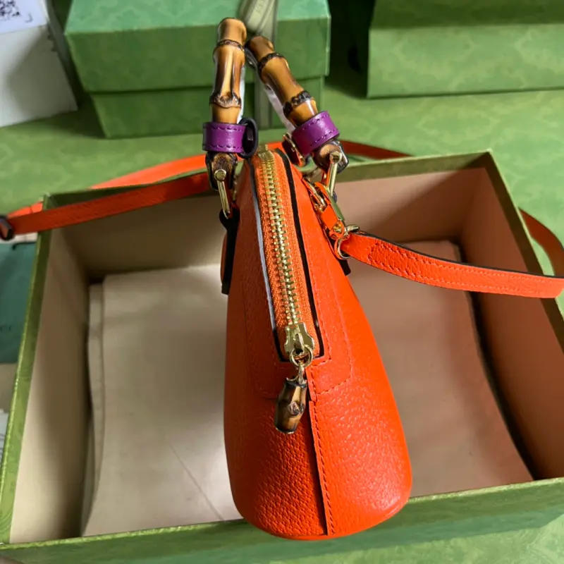 This Gbag Diana Bamboo Mini Tote Bag, complete with original green box packaging, features two recognizable brand elements: bamboo handles and Double G hardware. The orange leather and two handle straps complement each other beautifully, creating a dynamic and elegant look. This bag features orange leather with shiny antique gold-toned hardware. As shown in the picture, it comes with two decorative handles with Double Gs, bamboo handles (4.5cm drop), and a detachable and adjustable shoulder strap (55cm drop). Model No. 715775. Dimensions: 20cm (width) x 16cm (height) x 8.5cm (depth). Color: Orange/Original Leather.